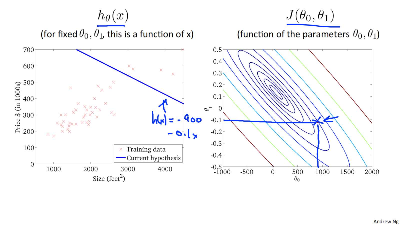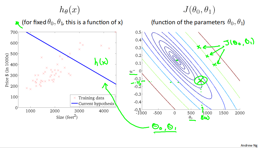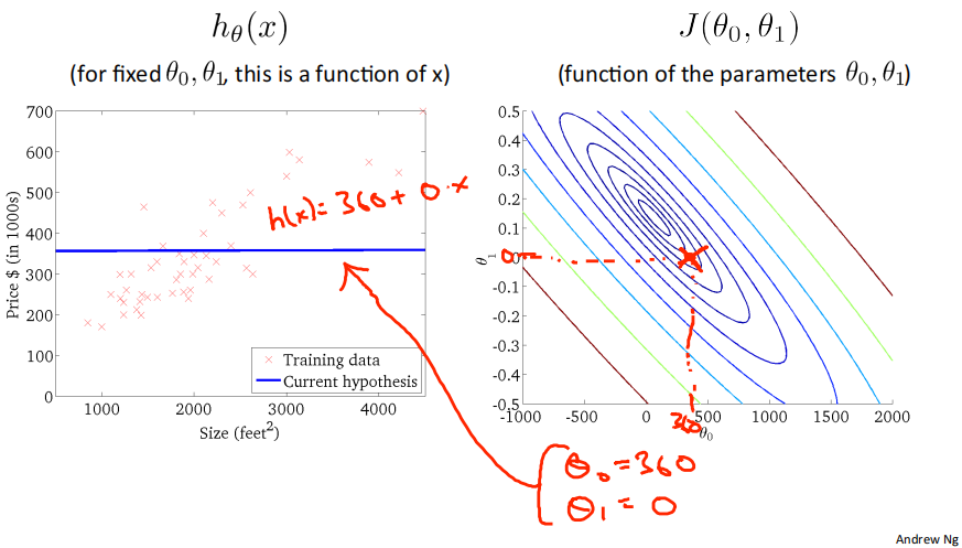 下面是几个例子,展示了位于等高线上不同点对应的ℎ_𝜃(𝑥)图像:
