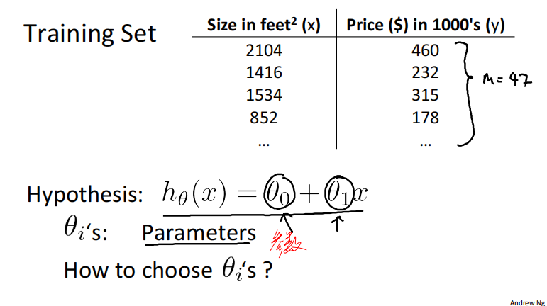 有一个线性回归的训练集,m代表训练样本的数量,本例中m =47。假设函数为如下线性函数形式: