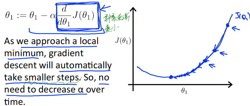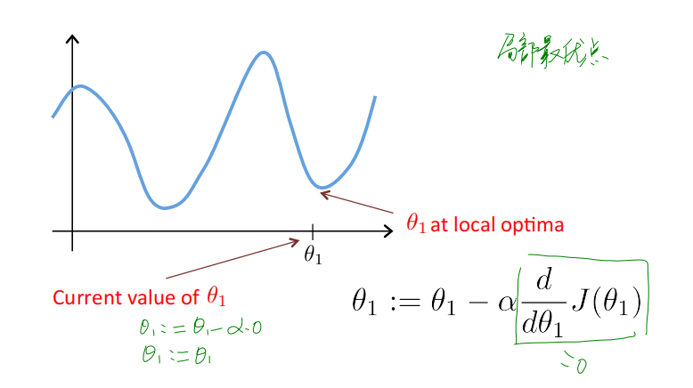 实际上,当𝜃_1的取值位于局部最低点时,公式中的导数项为0,算法做的就是将𝜃_1的取值再次赋给𝜃_1,实际上对𝜃_1的取值没有任何改变。