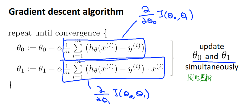 𝜃_0 := 𝜃_0-𝑎\\frac{1}{m}\\sum_{i=1}\^{m}{(ℎ_𝜃(𝑥\^𝑖) − 𝑦\^𝑖)} \\\\𝜃_1 := 𝜃_1-𝑎\\frac{1}{m}\\sum_{i=1}\^{m}{(ℎ_𝜃(𝑥\^𝑖) − 𝑦\^𝑖)𝑥\^𝑖}