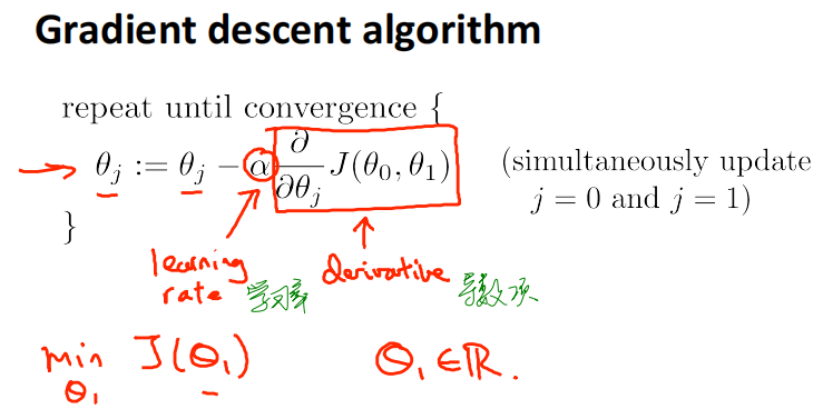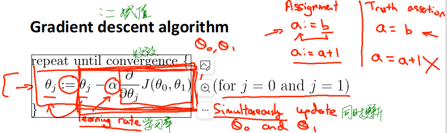 其中:=为赋值符号。𝑎是学习率(learning rate),它决定了我们沿着能让代价函数下降程度最大的方向向下迈出的步子有多大,在批量梯度下降中,我们每一次都同时让所有的参数减去学习速率乘以代价函数的导数。