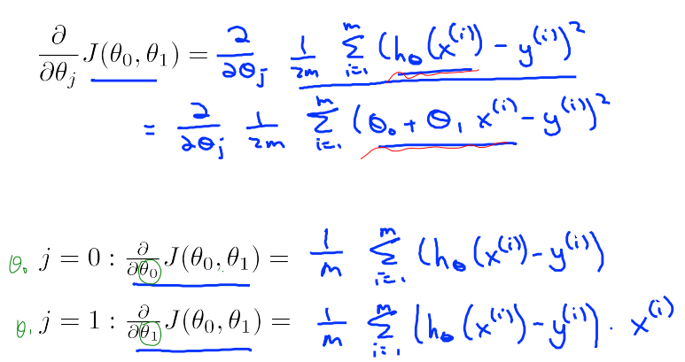 \\frac{𝜕}{𝜕𝜃_𝑗}𝐽(𝜃_0, 𝜃_1) = \\frac{𝜕}{𝜕𝜃_𝑗}\\frac{1}{2m}\\sum_{i=1}\^{m}{(ℎ_𝜃(𝑥\^𝑖) − 𝑦\^𝑖)\^2} \\\\=\\frac{𝜕}{𝜕𝜃_𝑗}\\frac{1}{2m}\\sum_{i=1}\^{m}{(𝜃_0+𝜃_1𝑥\^𝑖 − 𝑦\^𝑖)\^2}