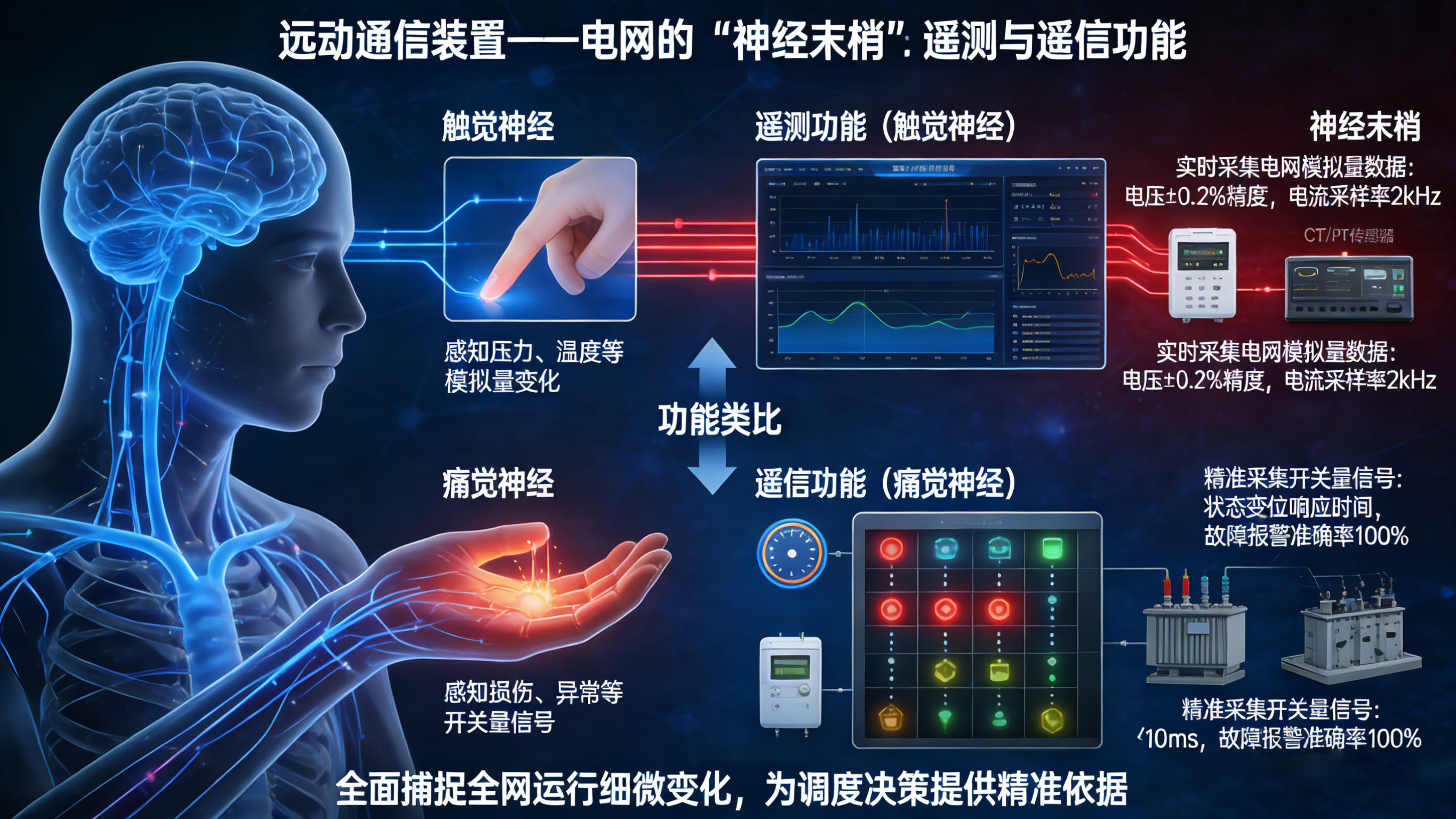 神经中枢的首要功能是感知身体状态,而远动通信装置的核心能力之一,就是通过"遥测""遥信"两大功能,成为电网的"神经末梢",全面捕捉全网运行的细微变化,为调度决策提供精准依据。