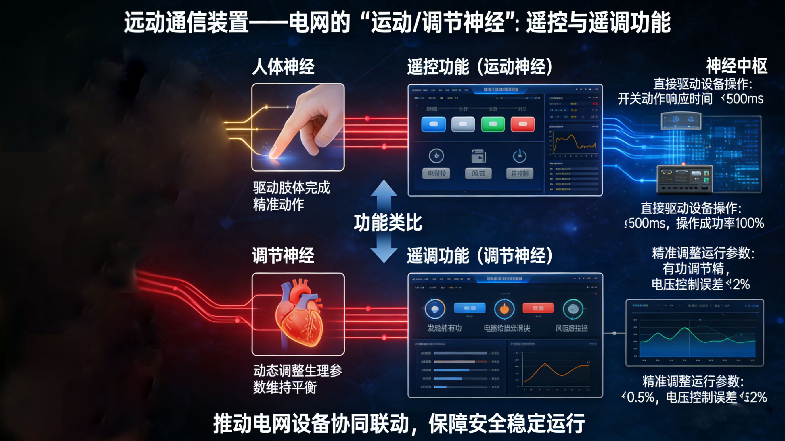 神经中枢的最终价值,在于通过指令执行实现身体的协调运作。远动通信装置的"神经中枢"价值,也最终体现在通过"遥控""遥调"功能,推动电网各设备协同联动,保障电网安全稳定运行。