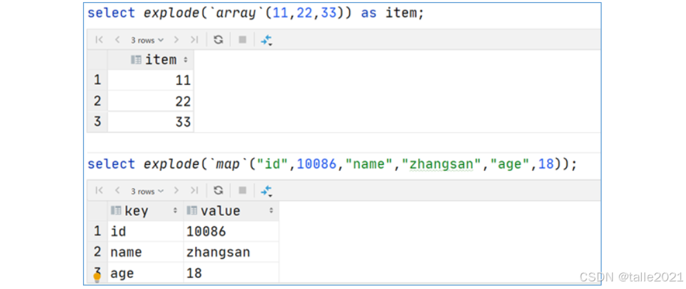 explode函数用于将一个集合或数组中的每个元素展开,将每个元素变成一行。explode(array)将array列表里的每个元素生成一行;explode(map)将map里的每一对元素作为一行,其中key为一列,value为一列。一般情况下,explode函数需要结合lateral view侧视图使用。