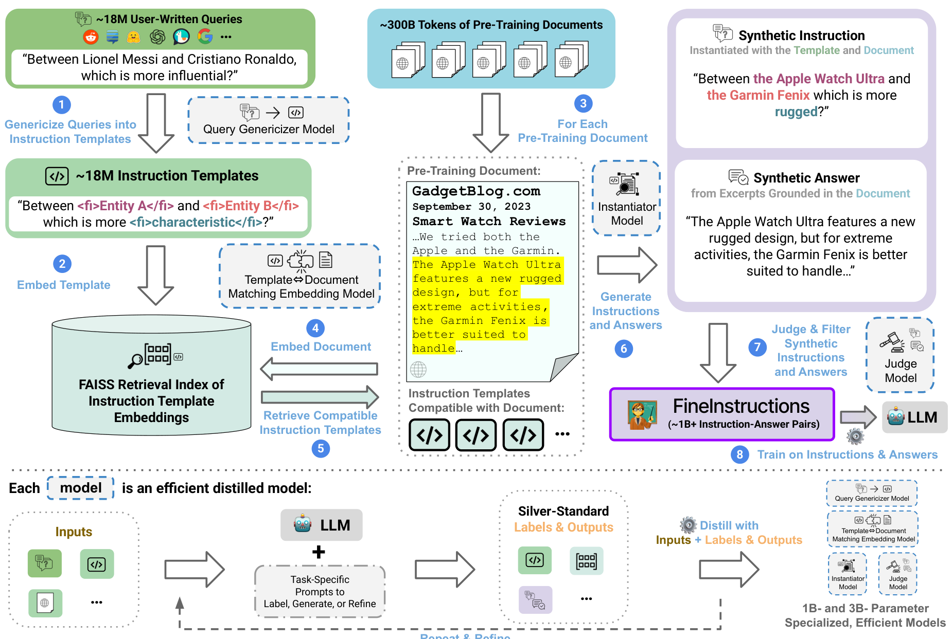 图 2. FineInstructions 流程:高效生成多样化、预训练规模的合成指令-回答对。