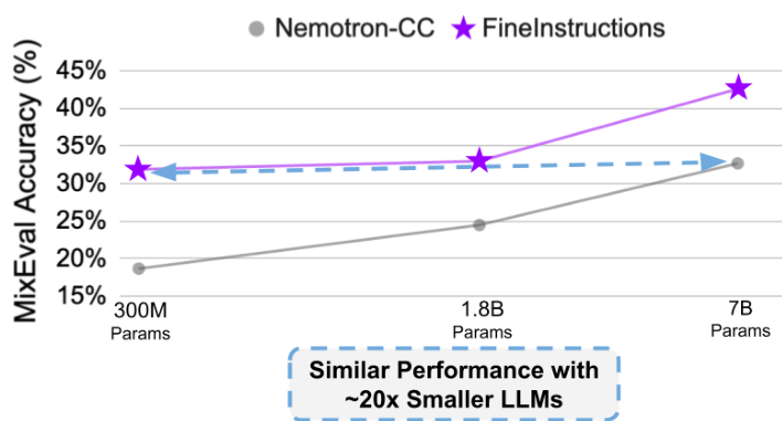 Original Abstract: Due to limited supervised training data, large language models (LLMs) are typically pre-trained via a self-supervised "predict the next word" objective on a vast amount of unstructured text data. To make the resulting model useful to users, it is further trained on a far smaller amount of "instruction-tuning" data comprised of supervised training examples of instructions and responses. To overcome the limited amount of supervised data, we propose a procedure that can transform the knowledge in internet-scale pre-training documents into billions of synthetic instruction and answer training pairs. The resulting dataset, called FineInstructions, uses ~18M instruction templates created from real user-written queries and prompts. These instruction templates are matched to and instantiated with human-written source documents from unstructured pre-training corpora. With "supervised" synthetic training data generated at this scale, an LLM can be pre-trained from scratch solely with the instruction-tuning objective, which is far more in-distribution with the expected downstream usage of LLMs (responding to user prompts). We conduct controlled token-for-token training experiments and find pre-training on FineInstructions outperforms standard pre-training and other proposed synthetic pre-training techniques on standard benchmarks measuring free-form response quality. Our resources can be found at https://huggingface.co/fineinstructions .
