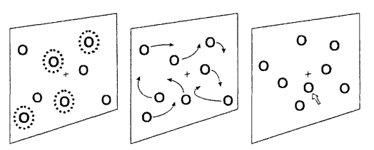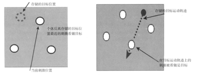 任务切换假说的分时操作要求存在一种灵活的存储机制,它能够在任务切换时存储当前任务的关键信息。具体的说,在多目标跟踪实验中,刺激突然从视野消失触发了一种离线存储机制,它能把视觉画面的当前信息保存下来。在刺激再现时,被试就可以把当前画面与存储的内容进行比较,使其与之前消失的刺激联系起来,从而继续完成追踪任务。既然对消失目标的追踪依赖于这种离线存储,那么它存储的主要内容是什么呢?在多目标追踪任务中所有刺激在特征属性(如颜色形状、大小等)上是完全一样的,目标和非目标的区别只体现在时空属性上。因此,要继续对消失目标的追踪,存储的内容应当包括刺激的时空属性。Fencsik等人认为系统不仅存储目标的位置信息,还存储目标的运动方向及轨迹信息。从消失到目标恢复的过程中,Fencsik等人还认为这里存在两种可能的机制:即基于位置的匹配和基于运动轨迹的匹配,如图5。前者指的是个体把当前画面的多个刺激的位置与存储目标(消失的目标)的位置进行比较,并把距离最短的当前画面刺激作为存储目标的重新再现;而后者认为目标复原还依靠存储目标的运动轨迹,当一个刺激再次出现在存储目标的运动轨迹上时,它更有可能被确认为目标。(Fenesik,Horowitz,Kliege和Wolfe,2004;2010)