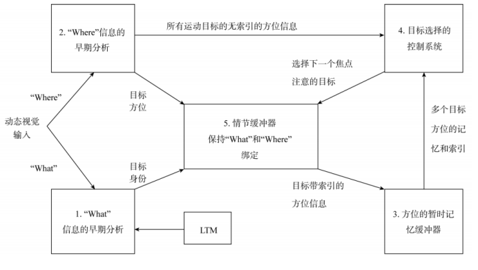 多身份追踪模型(MOMIT)由Oksama和Hyönä(2008)提出,专门用于解释多身份追踪任务范式现象。MOMIT由五个模块构成(如图3所示),分别为早期身份信息处理模块(标记为M1)、早期位置信息处理模块(M2)、位置临时记忆缓冲器(M3)、目标选择控制系统(M4)以及身份-位置信息绑定情境缓冲器(M5)。M1与长时记忆相连,使得熟悉的客体身份处理更快、追踪更容易。M1和M2分别将信息传输到M5中,形成并保持位置-身份绑定;M3的内容来自M5的目标客体的较早的临时位置信息,并将这些临时位置信息传递给M4,M4基于目标先前位置进行注意焦点切换,活跃程度最低的目标具有最高的切换优先级,模型假设只有处于注意焦点下的目标客体的位置信息方可被更新。