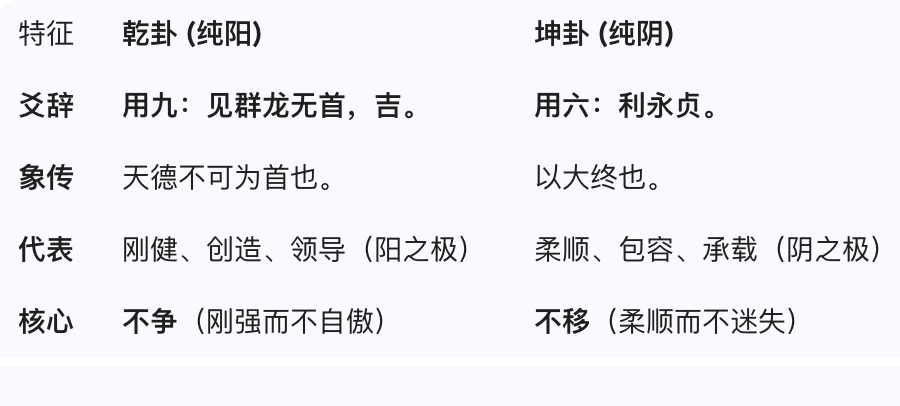 一句话概括: 最刚强的人要学会有所不为(群龙无首);最柔顺的人要学会心中有骨(利永贞)。