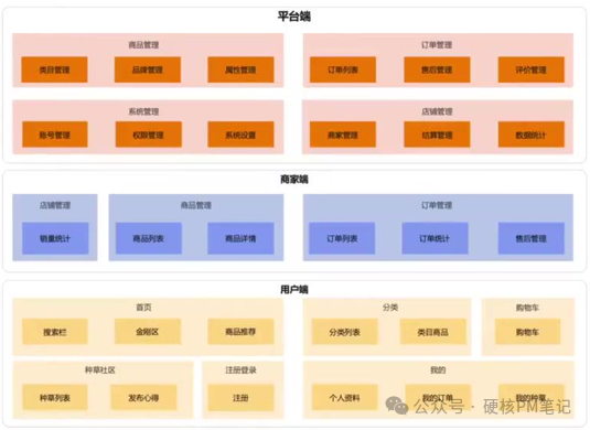 立项阶段不用画复杂的原型图,一张简单的产品架构图就够了。按 "用户端 + 商家端 + 平台端" 划分: