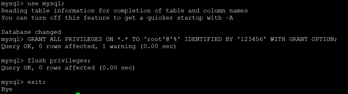 GRANT ALL PRIVILEGES ON *.* TO 'root'@'%' IDENTIFIED BY '123456' WITH GRANT OPTION;