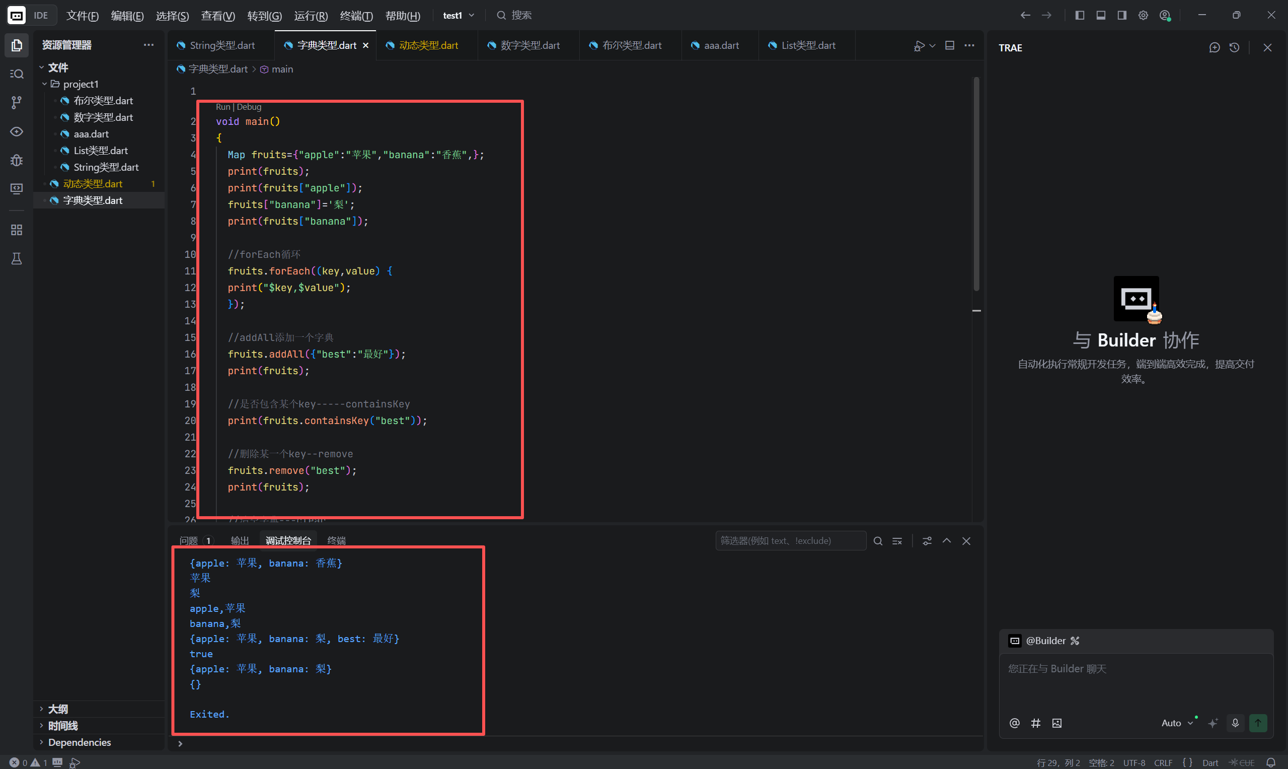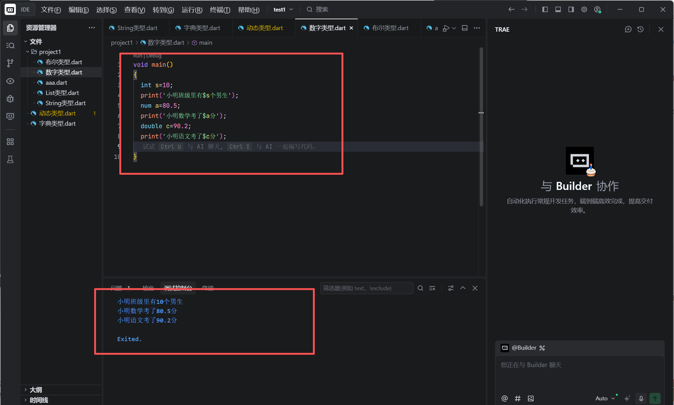 上图展示了字符串赋值、修改及模板插值的输出结果,清晰体现了 Dart 字符串的灵活性。