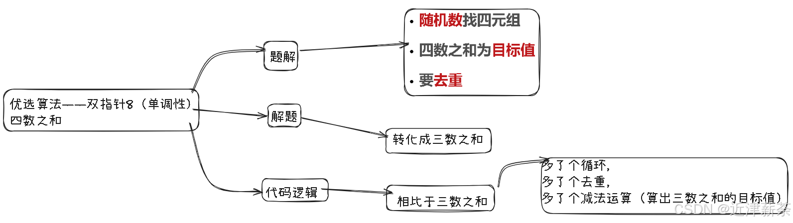 思路同三数之和一样,只是多了个循环,多了个去重,多了个减法运算(算出三数之和的目标值),既然会三数之和了,那么大家可以自己去尝试把它写出来啦~~