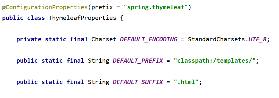 从ThymeleafAutoConfiguration的源代码中我们可以得知ThymeleafProperties中配置了Thymeleaf的规则