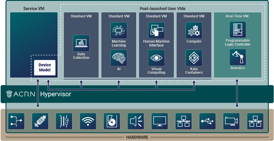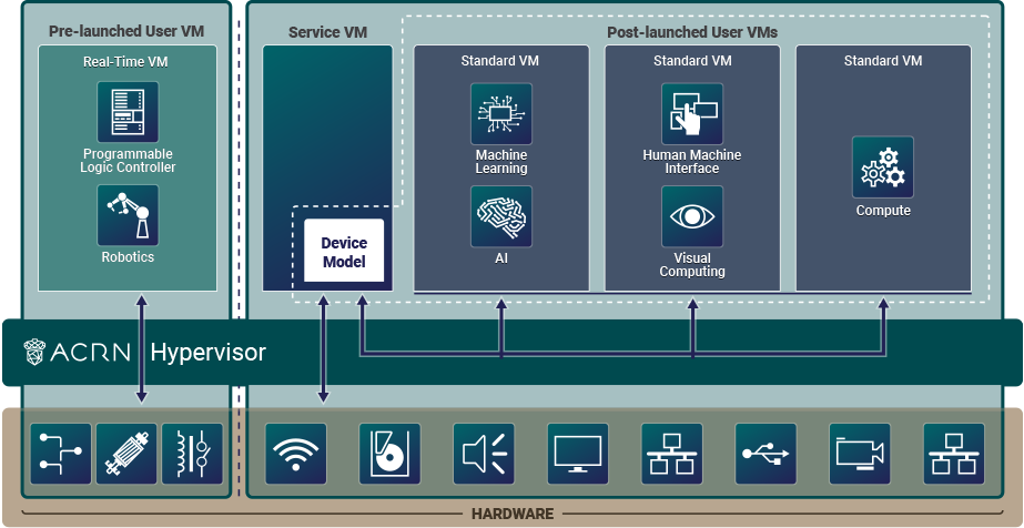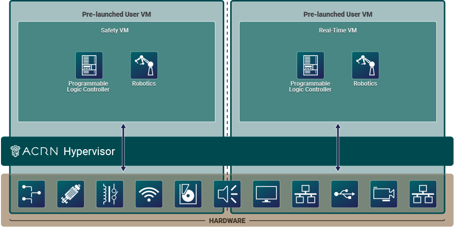 - ACRN 可以支持软实时操作系统(例如用于软 PLC 控制的 preempt-rt Linux),或者支持抖动较小的硬实时操作系统。