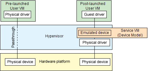 由于设备可能需要在多个 VM 之间共享,ACRN 通过 device emulation(设备模拟) 的方式,为 VM 及其 Guest OS 提供对共享设备的访问能力。