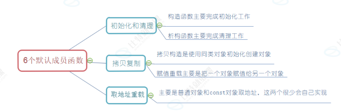 类的默认成员函数是在我们不显示实现的前提下,编译器隐式实现的成员函数,总共有六个,示意图如下