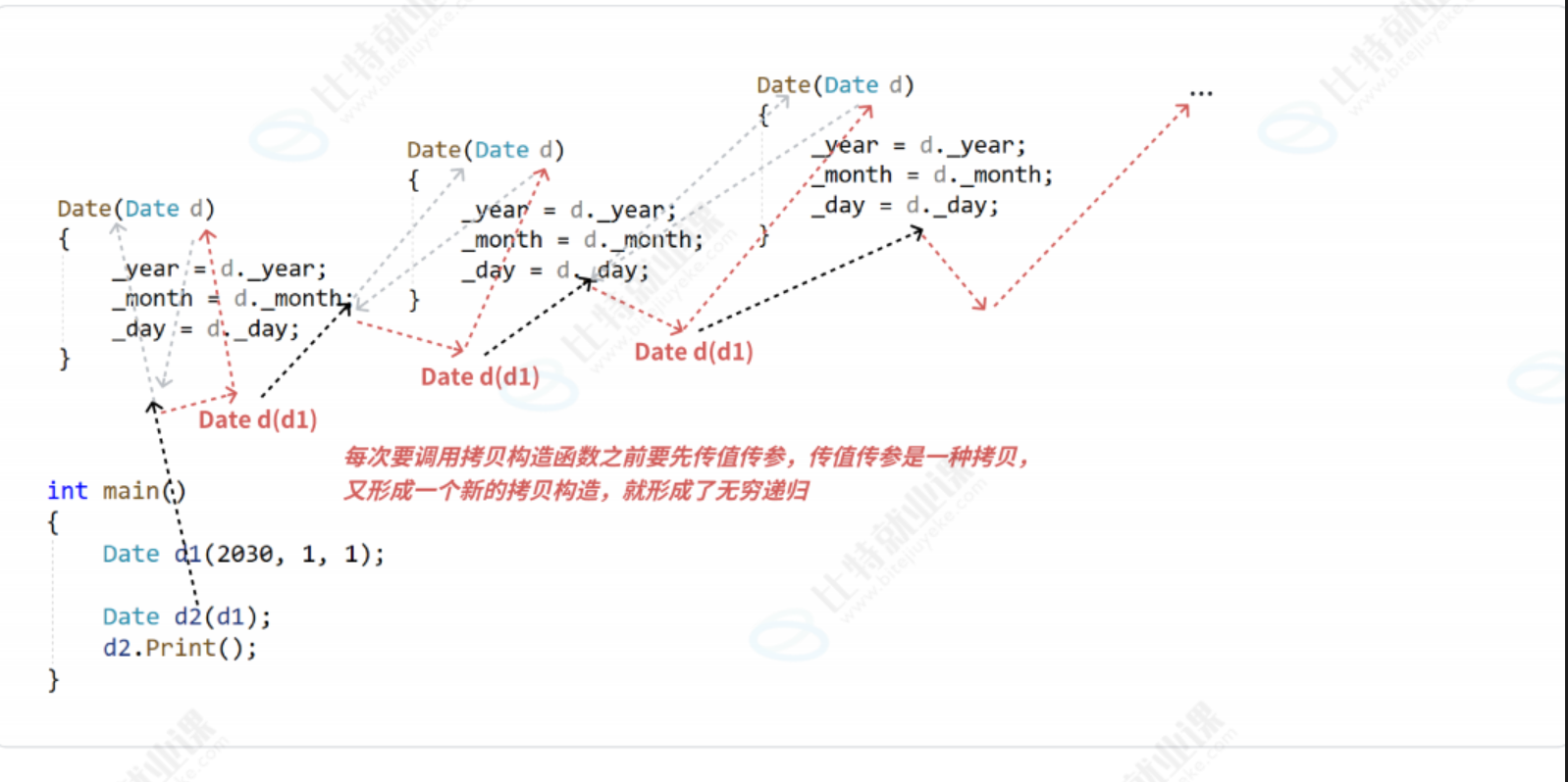 如果我们写的拷贝构造函数中第一个参数类型是类类型的值,在调用这个类类型的时候就会调用这个拷贝构造函数,这时候又会回到原来的困境,然后一直调用、一直没法彻底的结束这个进程,然后就死循环了。