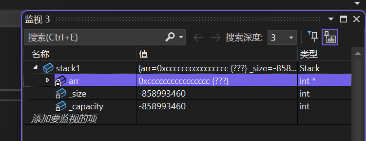 可以看到:_capacity和_size都被初始化了,_stack也分配了空间,这是符合我们的预期的