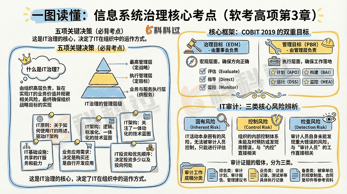 这份指南是针对软考信息系统项目管理师(第4版)教材第三章内容的深度解析,旨在通过结构化梳理帮助备考者高效掌握核心考点 。文章详细阐述了信息系统治理的理论框架,重点区分了IT治理的五项关键决策以及COBIT框架中治理与管理的职能差异 。此外,文档还深入剖析了IT审计的风险分类与标准体系,并辅以高频习题演练来强化对实战考情的理解。其核心目标是通过分值分析与重点速记的结合,指导考生在有限时间内精准识别并攻克这一章节的理论重难点。