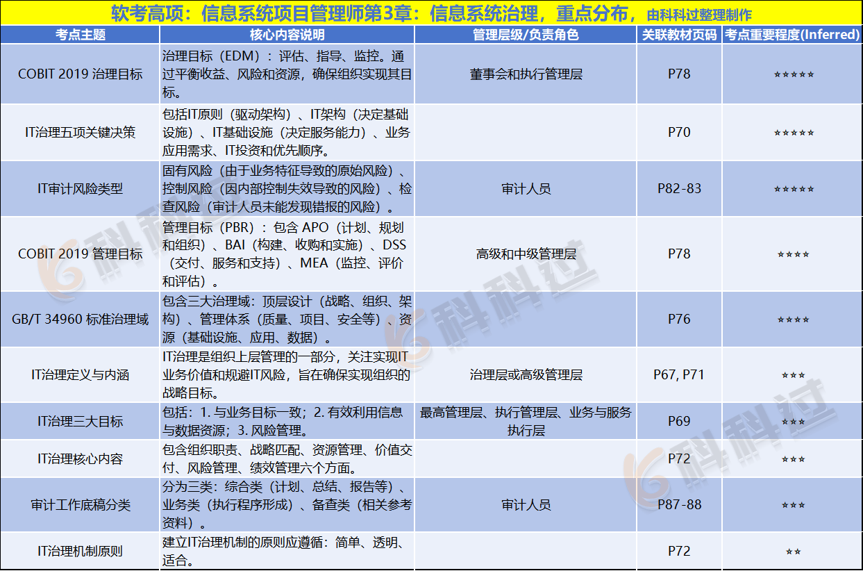 【备考策略】 本章理论性强,重点在于【区分概念】核心要点是【IT治理的五项关键决策】【COBIT框架的治理与管理区分】以及【IT审计的风险与方法】