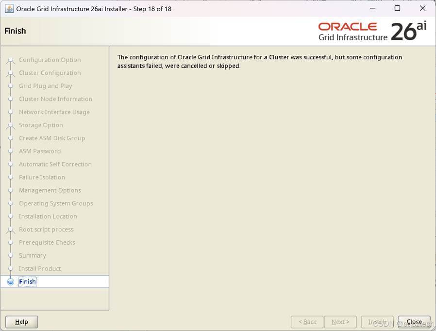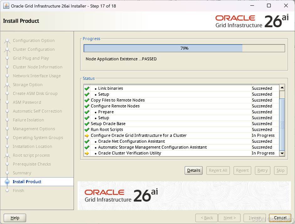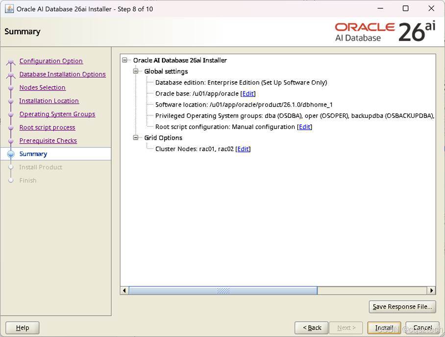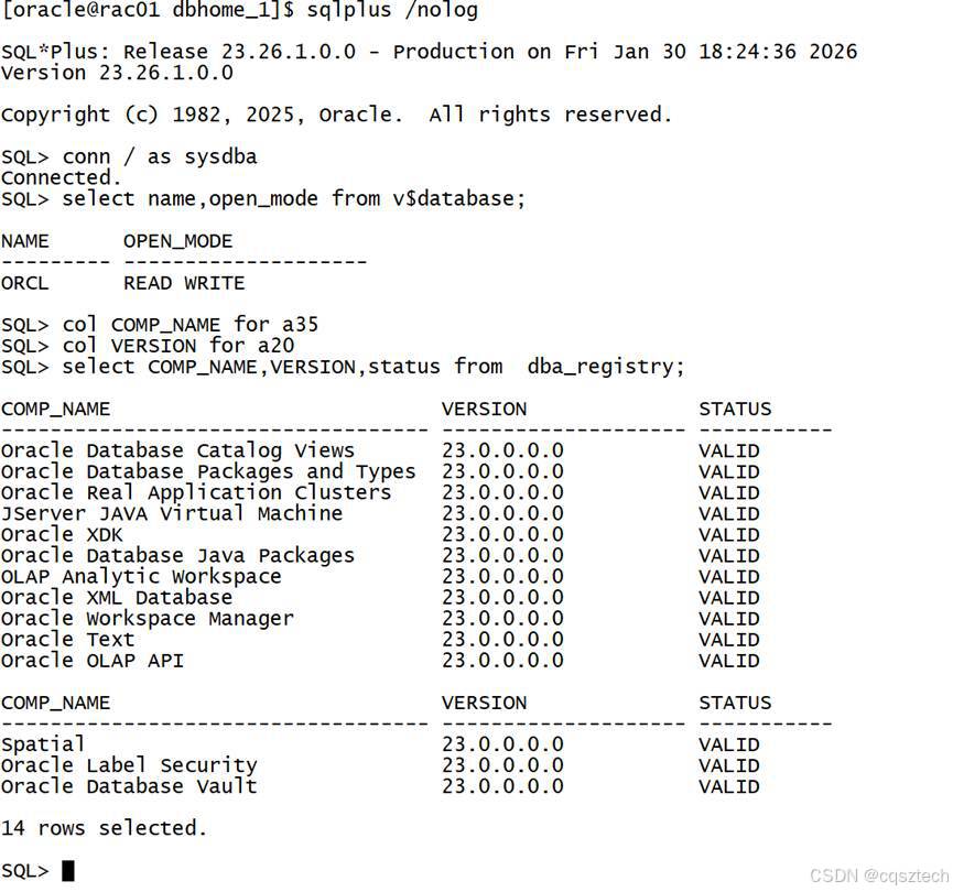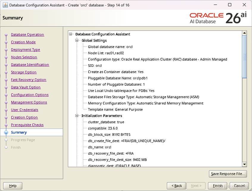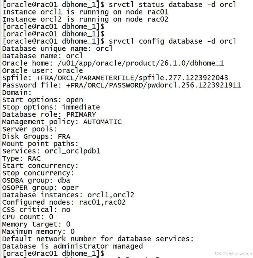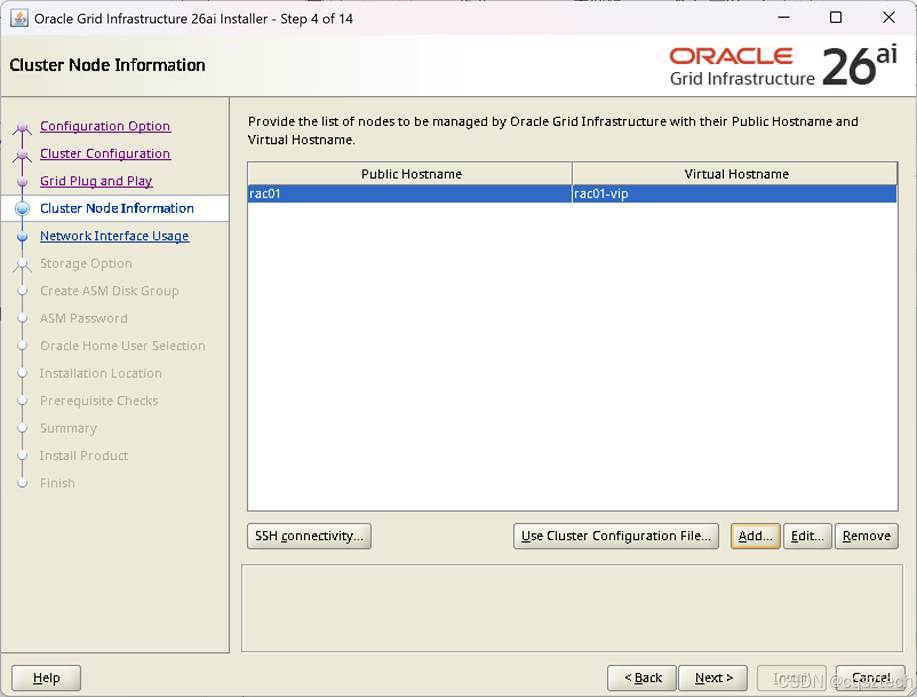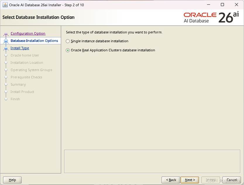 root@rac01 grid\]# 二号机 \[root@rac02 grid\]# /u01/app/26.1.0/grid/root.sh Performing root user operation. The following environment variables are set as: ORACLE_OWNER= grid ORACLE_HOME= /u01/app/26.1.0/grid Enter the full pathname of the local bin directory: \[/usr/local/bin\]: The contents of "dbhome" have not changed. No need to overwrite. The contents of "oraenv" have not changed. No need to overwrite. The contents of "coraenv" have not changed. No need to overwrite. Creating /etc/oratab file... Entries will be added to the /etc/oratab file as needed by Database Configuration Assistant when a database is created Finished running generic part of root script. Now product-specific root actions will be performed. RAC option enabled on: Linux Executing command '/u01/app/26.1.0/grid/perl/bin/perl -I/u01/app/26.1.0/grid/perl/lib -I/u01/app/26.1.0/grid/crs/install /u01/app/26.1.0/grid/crs/install/rootcrs.pl ' Using configuration parameter file: /u01/app/26.1.0/grid/crs/install/crsconfig_params The log of current session can be found at: /u01/app/grid/crsdata/rac02/crsconfig/rootcrs_rac02_2026-01-30_05-18-53PM.log 2026/01/30 17:18:59 CLSRSC-594: Executing installation step 1 of 18: 'ValidateEnv'. 2026/01/30 17:19:00 CLSRSC-594: Executing installation step 2 of 18: 'CheckRootCert'. 2026/01/30 17:19:00 CLSRSC-594: Executing installation step 3 of 18: 'GenSiteGUIDs'. 2026/01/30 17:19:00 CLSRSC-594: Executing installation step 4 of 18: 'SetupOSD'. Redirecting to /bin/systemctl restart rsyslog.service 2026/01/30 17:19:01 CLSRSC-594: Executing installation step 5 of 18: 'CheckCRSConfig'. 2026/01/30 17:19:01 CLSRSC-594: Executing installation step 6 of 18: 'SetupLocalGPNP'. 2026/01/30 17:19:01 CLSRSC-594: Executing installation step 7 of 18: 'CreateRootCert'. 2026/01/30 17:19:01 CLSRSC-594: Executing installation step 8 of 18: 'ConfigOLR'. 2026/01/30 17:19:05 CLSRSC-594: Executing installation step 9 of 18: 'ConfigCHMOS'. 2026/01/30 17:19:05 CLSRSC-594: Executing installation step 10 of 18: 'CreateOHASD'. 2026/01/30 17:19:06 CLSRSC-594: Executing installation step 11 of 18: 'ConfigOHASD'. 2026/01/30 17:19:06 CLSRSC-330: Adding Clusterware entries to file 'oracle-ohasd.service' 2026/01/30 17:19:17 CLSRSC-594: Executing installation step 12 of 18: 'SetupTFA'. 2026/01/30 17:19:17 CLSRSC-594: Executing installation step 13 of 18: 'InstallACFS'. 2026/01/30 17:19:19 CLSRSC-594: Executing installation step 14 of 18: 'CheckFirstNode'. 2026/01/30 17:19:20 CLSRSC-594: Executing installation step 15 of 18: 'InitConfig'. 2026/01/30 17:19:24 CLSRSC-594: Executing installation step 16 of 18: 'StartCluster'. 2026/01/30 17:19:36 CLSRSC-343: Successfully started Oracle Clusterware stack 2026/01/30 17:19:36 CLSRSC-594: Executing installation step 17 of 18: 'ConfigNode'. 2026/01/30 17:19:36 CLSRSC-594: Executing installation step 18 of 18: 'PostConfig'. 2026/01/30 17:19:41 CLSRSC-325: Configure Oracle Grid Infrastructure for a Cluster ... succeeded \[root@rac02 grid\]# 2026/01/30 17:20:17 CLSRSC-4002: Successfully installed Oracle Autonomous Health Framework (AHF). \[root@rac02 grid\]#   没有配置DNS,可以跳过。  1. 1. 验证一下     1. ASM磁盘组创建      到此,ASM磁盘组创建完。 1. RAC安装 1. 解压 Su - oracle unzip -d $ORACLE_HOME LINUX.X64_2326100_db_home.zip 1. 1. 安装RAC cd $ORACLE_HOME/ export DISPLAY=192.168.133.1:0.0 ./runInstaller    这里和 GI安装一样,使用手工去创建SSH对等性,否则要报错。    这里和GI安装一样,不勾选,手工去执行脚本     到此,软件安装完成 1. 1. 2. DB创建    数据库类型中多了一个:标准版 ha  管理策略多了一个rank            口令不符合标准,可以忽略。          看来26ai,内部组件版本,还是 23 到此,26ai 的安装就结束了。 1. 卸载 8.1 卸载db Su -- oracle Cd $ORACLE_HOME/deinstall ./deinstall Checking for required files and bootstrapping ... Please wait ... Location of logs /u01/app/oraInventory/logs/ ############ ORACLE DECONFIG TOOL START ############ ######################### DECONFIG CHECK OPERATION START ######################### ## \[START\] Install check configuration ## Checking for existence of the Oracle home location /u01/app/oracle/product/26.1.0/dbhome_1 Oracle Home type selected for deinstall is: Oracle Real Application Cluster Database Oracle Base selected for deinstall is: /u01/app/oracle Checking for existence of central inventory location /u01/app/oraInventory Checking for existence of the Oracle Grid Infrastructure home /u01/app/26.1.0/grid The following nodes are part of this cluster: rac01,rac02 Checking for sufficient temp space availability on node(s) : 'rac01' ## \[END\] Install check configuration ## Network Configuration check config START Network de-configuration trace file location: /u01/app/oraInventory/logs/netdc_check2026-01-30_04-12-47PM.log Network Configuration check config END Database Check Configuration START Database de-configuration trace file location: /u01/app/oraInventory/logs/databasedc_check2026-01-30_04-12-47PM.log Use comma as separator when specifying list of values as input Specify the list of database names that are configured in this Oracle home \[orcl\]: ###### For Database 'orcl' ###### RAC Database The nodes on which this database has instances: \[rac01, rac02