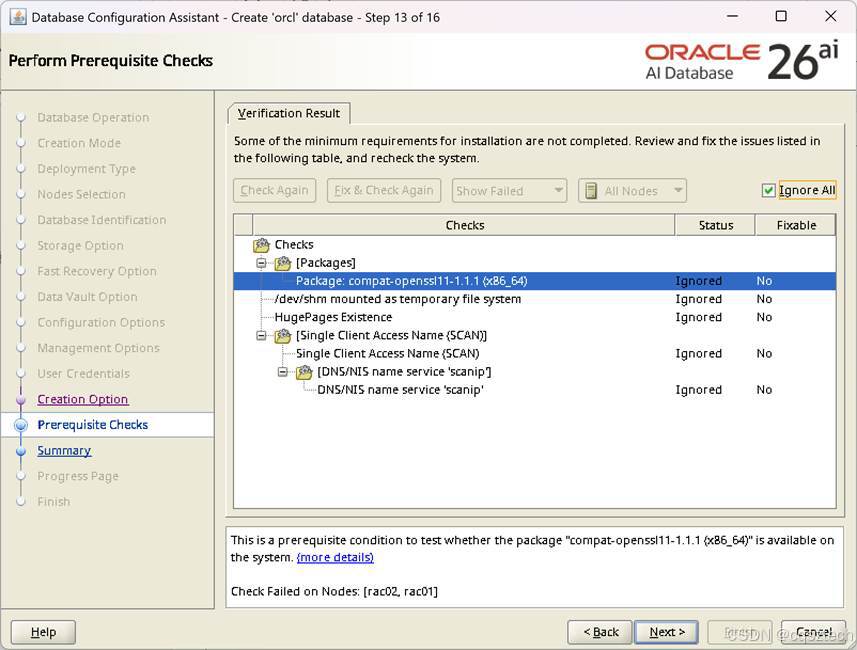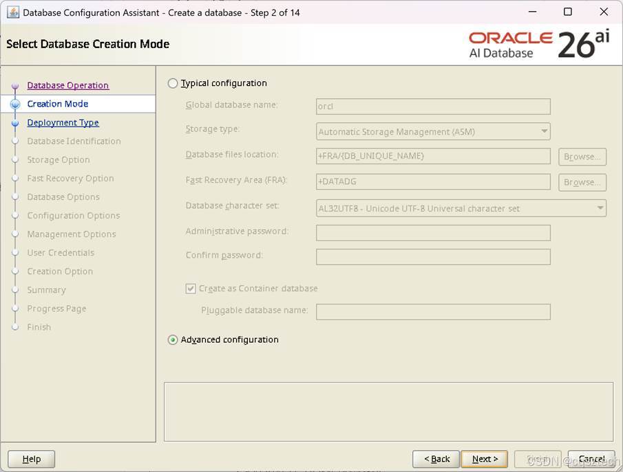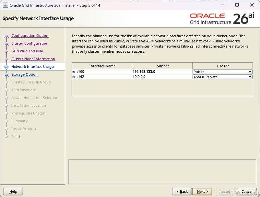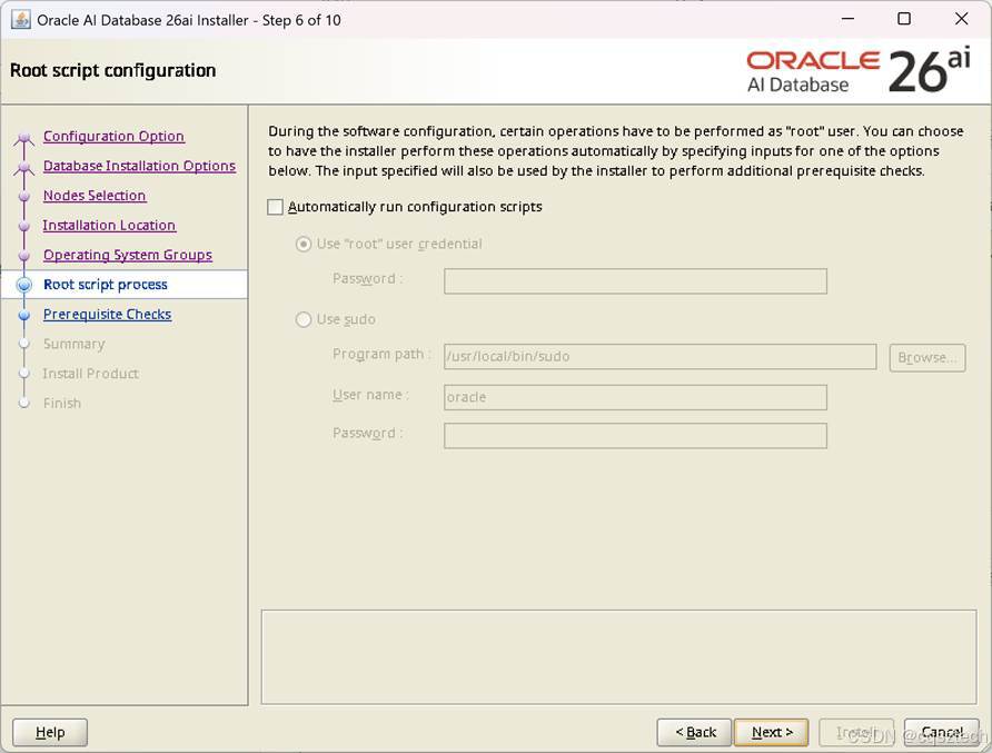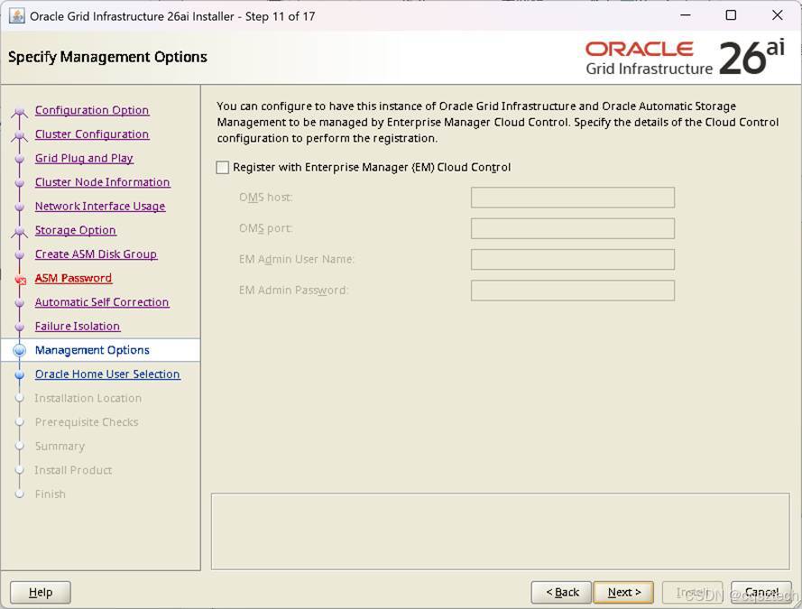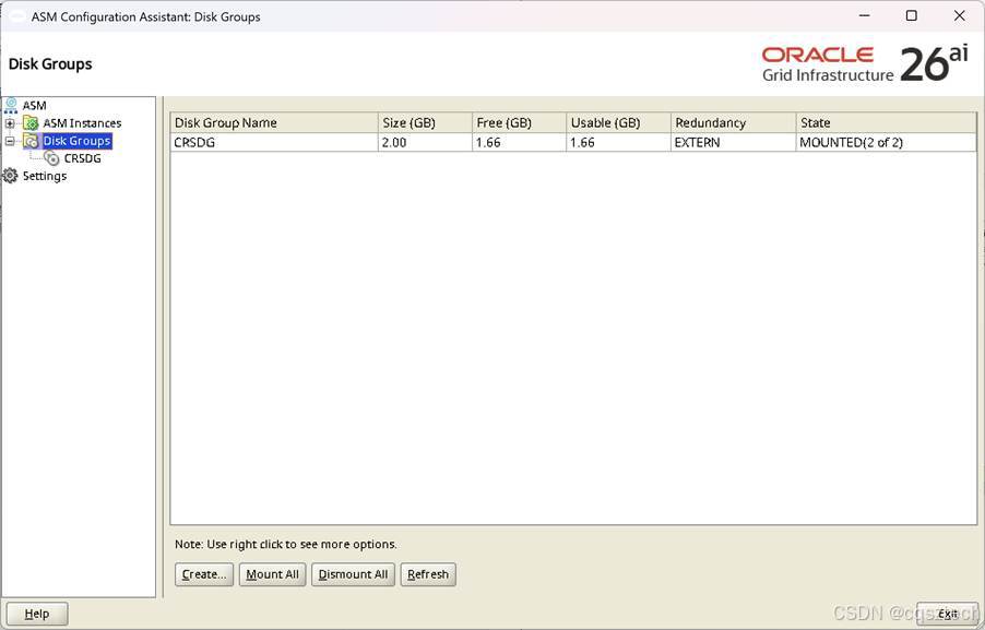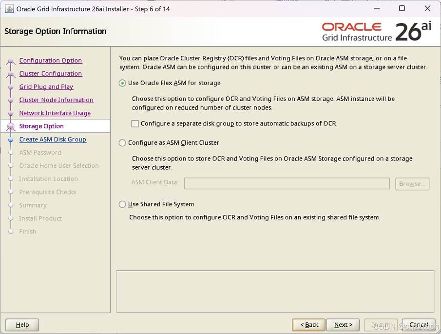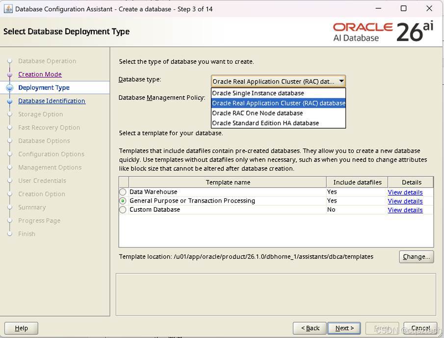 root@rac01 grid\]# 二号机 \[root@rac02 grid\]# /u01/app/26.1.0/grid/root.sh Performing root user operation. The following environment variables are set as: ORACLE_OWNER= grid ORACLE_HOME= /u01/app/26.1.0/grid Enter the full pathname of the local bin directory: \[/usr/local/bin\]: The contents of "dbhome" have not changed. No need to overwrite. The contents of "oraenv" have not changed. No need to overwrite. The contents of "coraenv" have not changed. No need to overwrite. Creating /etc/oratab file... Entries will be added to the /etc/oratab file as needed by Database Configuration Assistant when a database is created Finished running generic part of root script. Now product-specific root actions will be performed. RAC option enabled on: Linux Executing command '/u01/app/26.1.0/grid/perl/bin/perl -I/u01/app/26.1.0/grid/perl/lib -I/u01/app/26.1.0/grid/crs/install /u01/app/26.1.0/grid/crs/install/rootcrs.pl ' Using configuration parameter file: /u01/app/26.1.0/grid/crs/install/crsconfig_params The log of current session can be found at: /u01/app/grid/crsdata/rac02/crsconfig/rootcrs_rac02_2026-01-30_05-18-53PM.log 2026/01/30 17:18:59 CLSRSC-594: Executing installation step 1 of 18: 'ValidateEnv'. 2026/01/30 17:19:00 CLSRSC-594: Executing installation step 2 of 18: 'CheckRootCert'. 2026/01/30 17:19:00 CLSRSC-594: Executing installation step 3 of 18: 'GenSiteGUIDs'. 2026/01/30 17:19:00 CLSRSC-594: Executing installation step 4 of 18: 'SetupOSD'. Redirecting to /bin/systemctl restart rsyslog.service 2026/01/30 17:19:01 CLSRSC-594: Executing installation step 5 of 18: 'CheckCRSConfig'. 2026/01/30 17:19:01 CLSRSC-594: Executing installation step 6 of 18: 'SetupLocalGPNP'. 2026/01/30 17:19:01 CLSRSC-594: Executing installation step 7 of 18: 'CreateRootCert'. 2026/01/30 17:19:01 CLSRSC-594: Executing installation step 8 of 18: 'ConfigOLR'. 2026/01/30 17:19:05 CLSRSC-594: Executing installation step 9 of 18: 'ConfigCHMOS'. 2026/01/30 17:19:05 CLSRSC-594: Executing installation step 10 of 18: 'CreateOHASD'. 2026/01/30 17:19:06 CLSRSC-594: Executing installation step 11 of 18: 'ConfigOHASD'. 2026/01/30 17:19:06 CLSRSC-330: Adding Clusterware entries to file 'oracle-ohasd.service' 2026/01/30 17:19:17 CLSRSC-594: Executing installation step 12 of 18: 'SetupTFA'. 2026/01/30 17:19:17 CLSRSC-594: Executing installation step 13 of 18: 'InstallACFS'. 2026/01/30 17:19:19 CLSRSC-594: Executing installation step 14 of 18: 'CheckFirstNode'. 2026/01/30 17:19:20 CLSRSC-594: Executing installation step 15 of 18: 'InitConfig'. 2026/01/30 17:19:24 CLSRSC-594: Executing installation step 16 of 18: 'StartCluster'. 2026/01/30 17:19:36 CLSRSC-343: Successfully started Oracle Clusterware stack 2026/01/30 17:19:36 CLSRSC-594: Executing installation step 17 of 18: 'ConfigNode'. 2026/01/30 17:19:36 CLSRSC-594: Executing installation step 18 of 18: 'PostConfig'. 2026/01/30 17:19:41 CLSRSC-325: Configure Oracle Grid Infrastructure for a Cluster ... succeeded \[root@rac02 grid\]# 2026/01/30 17:20:17 CLSRSC-4002: Successfully installed Oracle Autonomous Health Framework (AHF). \[root@rac02 grid\]#   没有配置DNS,可以跳过。  1. 1. 验证一下     1. ASM磁盘组创建      到此,ASM磁盘组创建完。 1. RAC安装 1. 解压 Su - oracle unzip -d $ORACLE_HOME LINUX.X64_2326100_db_home.zip 1. 1. 安装RAC cd $ORACLE_HOME/ export DISPLAY=192.168.133.1:0.0 ./runInstaller    这里和 GI安装一样,使用手工去创建SSH对等性,否则要报错。    这里和GI安装一样,不勾选,手工去执行脚本     到此,软件安装完成 1. 1. 2. DB创建    数据库类型中多了一个:标准版 ha  管理策略多了一个rank            口令不符合标准,可以忽略。          看来26ai,内部组件版本,还是 23 到此,26ai 的安装就结束了。 1. 卸载 8.1 卸载db Su -- oracle Cd $ORACLE_HOME/deinstall ./deinstall Checking for required files and bootstrapping ... Please wait ... Location of logs /u01/app/oraInventory/logs/ ############ ORACLE DECONFIG TOOL START ############ ######################### DECONFIG CHECK OPERATION START ######################### ## \[START\] Install check configuration ## Checking for existence of the Oracle home location /u01/app/oracle/product/26.1.0/dbhome_1 Oracle Home type selected for deinstall is: Oracle Real Application Cluster Database Oracle Base selected for deinstall is: /u01/app/oracle Checking for existence of central inventory location /u01/app/oraInventory Checking for existence of the Oracle Grid Infrastructure home /u01/app/26.1.0/grid The following nodes are part of this cluster: rac01,rac02 Checking for sufficient temp space availability on node(s) : 'rac01' ## \[END\] Install check configuration ## Network Configuration check config START Network de-configuration trace file location: /u01/app/oraInventory/logs/netdc_check2026-01-30_04-12-47PM.log Network Configuration check config END Database Check Configuration START Database de-configuration trace file location: /u01/app/oraInventory/logs/databasedc_check2026-01-30_04-12-47PM.log Use comma as separator when specifying list of values as input Specify the list of database names that are configured in this Oracle home \[orcl\]: ###### For Database 'orcl' ###### RAC Database The nodes on which this database has instances: \[rac01, rac02
