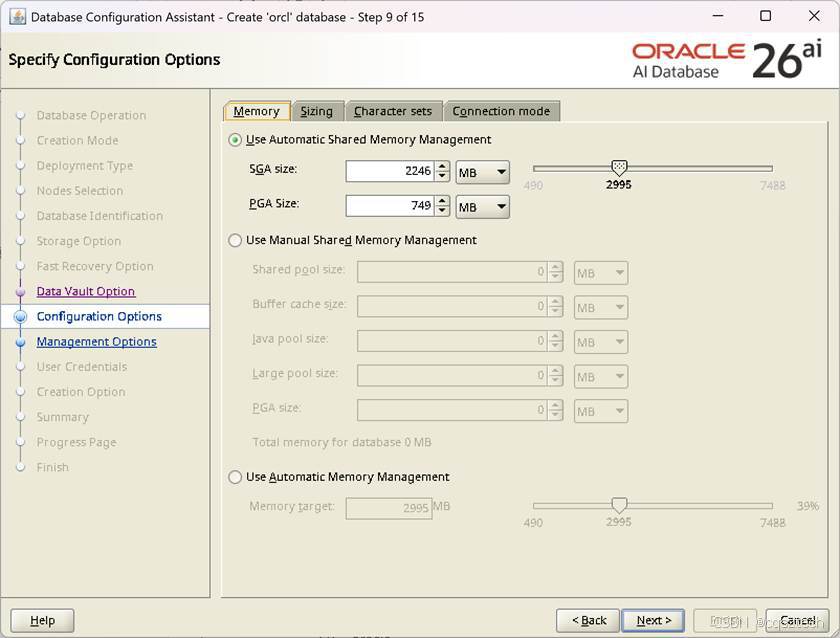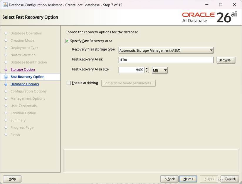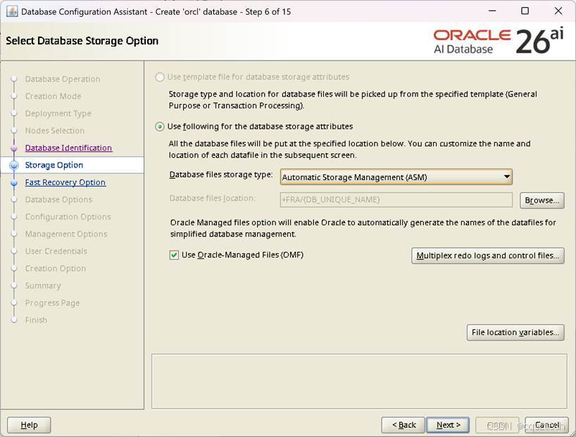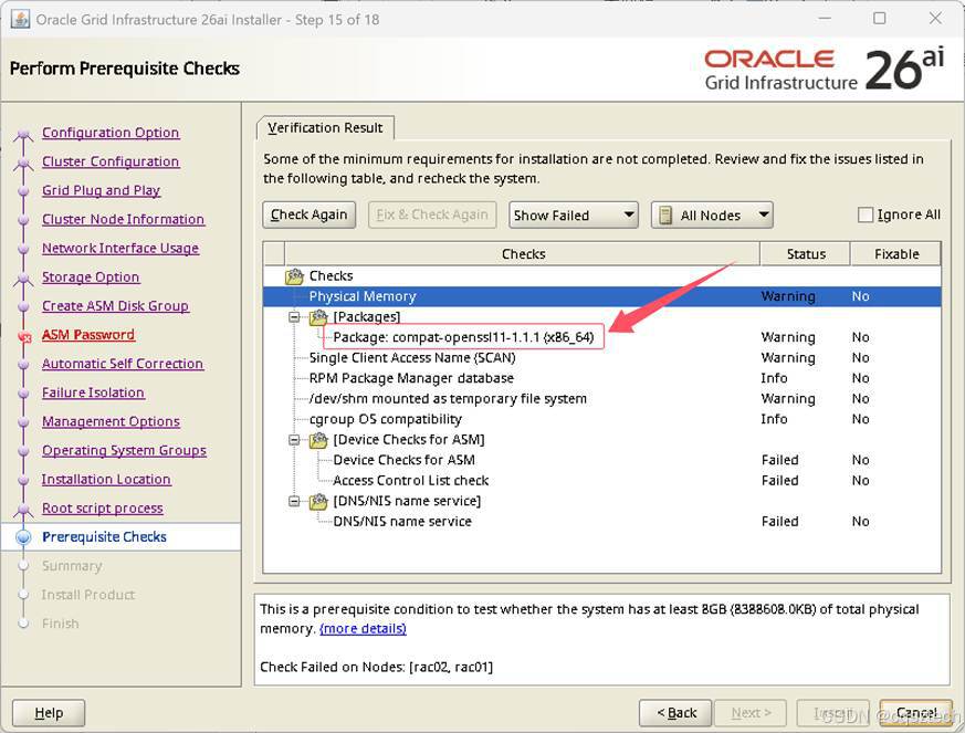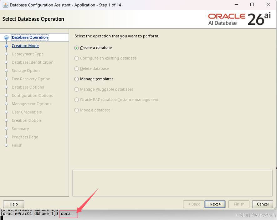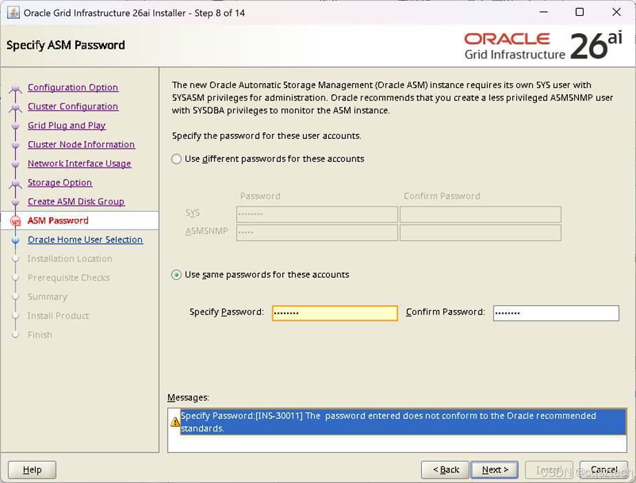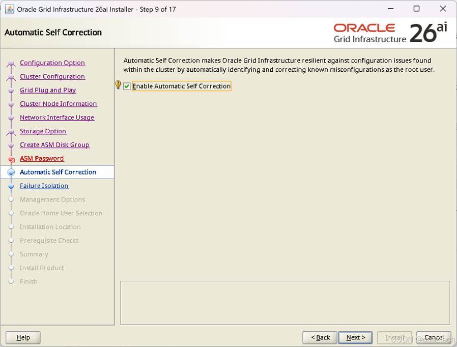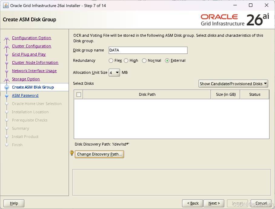 root@rac01 grid\]# 二号机 \[root@rac02 grid\]# /u01/app/26.1.0/grid/root.sh Performing root user operation. The following environment variables are set as: ORACLE_OWNER= grid ORACLE_HOME= /u01/app/26.1.0/grid Enter the full pathname of the local bin directory: \[/usr/local/bin\]: The contents of "dbhome" have not changed. No need to overwrite. The contents of "oraenv" have not changed. No need to overwrite. The contents of "coraenv" have not changed. No need to overwrite. Creating /etc/oratab file... Entries will be added to the /etc/oratab file as needed by Database Configuration Assistant when a database is created Finished running generic part of root script. Now product-specific root actions will be performed. RAC option enabled on: Linux Executing command '/u01/app/26.1.0/grid/perl/bin/perl -I/u01/app/26.1.0/grid/perl/lib -I/u01/app/26.1.0/grid/crs/install /u01/app/26.1.0/grid/crs/install/rootcrs.pl ' Using configuration parameter file: /u01/app/26.1.0/grid/crs/install/crsconfig_params The log of current session can be found at: /u01/app/grid/crsdata/rac02/crsconfig/rootcrs_rac02_2026-01-30_05-18-53PM.log 2026/01/30 17:18:59 CLSRSC-594: Executing installation step 1 of 18: 'ValidateEnv'. 2026/01/30 17:19:00 CLSRSC-594: Executing installation step 2 of 18: 'CheckRootCert'. 2026/01/30 17:19:00 CLSRSC-594: Executing installation step 3 of 18: 'GenSiteGUIDs'. 2026/01/30 17:19:00 CLSRSC-594: Executing installation step 4 of 18: 'SetupOSD'. Redirecting to /bin/systemctl restart rsyslog.service 2026/01/30 17:19:01 CLSRSC-594: Executing installation step 5 of 18: 'CheckCRSConfig'. 2026/01/30 17:19:01 CLSRSC-594: Executing installation step 6 of 18: 'SetupLocalGPNP'. 2026/01/30 17:19:01 CLSRSC-594: Executing installation step 7 of 18: 'CreateRootCert'. 2026/01/30 17:19:01 CLSRSC-594: Executing installation step 8 of 18: 'ConfigOLR'. 2026/01/30 17:19:05 CLSRSC-594: Executing installation step 9 of 18: 'ConfigCHMOS'. 2026/01/30 17:19:05 CLSRSC-594: Executing installation step 10 of 18: 'CreateOHASD'. 2026/01/30 17:19:06 CLSRSC-594: Executing installation step 11 of 18: 'ConfigOHASD'. 2026/01/30 17:19:06 CLSRSC-330: Adding Clusterware entries to file 'oracle-ohasd.service' 2026/01/30 17:19:17 CLSRSC-594: Executing installation step 12 of 18: 'SetupTFA'. 2026/01/30 17:19:17 CLSRSC-594: Executing installation step 13 of 18: 'InstallACFS'. 2026/01/30 17:19:19 CLSRSC-594: Executing installation step 14 of 18: 'CheckFirstNode'. 2026/01/30 17:19:20 CLSRSC-594: Executing installation step 15 of 18: 'InitConfig'. 2026/01/30 17:19:24 CLSRSC-594: Executing installation step 16 of 18: 'StartCluster'. 2026/01/30 17:19:36 CLSRSC-343: Successfully started Oracle Clusterware stack 2026/01/30 17:19:36 CLSRSC-594: Executing installation step 17 of 18: 'ConfigNode'. 2026/01/30 17:19:36 CLSRSC-594: Executing installation step 18 of 18: 'PostConfig'. 2026/01/30 17:19:41 CLSRSC-325: Configure Oracle Grid Infrastructure for a Cluster ... succeeded \[root@rac02 grid\]# 2026/01/30 17:20:17 CLSRSC-4002: Successfully installed Oracle Autonomous Health Framework (AHF). \[root@rac02 grid\]#   没有配置DNS,可以跳过。  1. 1. 验证一下     1. ASM磁盘组创建      到此,ASM磁盘组创建完。 1. RAC安装 1. 解压 Su - oracle unzip -d $ORACLE_HOME LINUX.X64_2326100_db_home.zip 1. 1. 安装RAC cd $ORACLE_HOME/ export DISPLAY=192.168.133.1:0.0 ./runInstaller    这里和 GI安装一样,使用手工去创建SSH对等性,否则要报错。    这里和GI安装一样,不勾选,手工去执行脚本     到此,软件安装完成 1. 1. 2. DB创建    数据库类型中多了一个:标准版 ha  管理策略多了一个rank            口令不符合标准,可以忽略。          看来26ai,内部组件版本,还是 23 到此,26ai 的安装就结束了。 1. 卸载 8.1 卸载db Su -- oracle Cd $ORACLE_HOME/deinstall ./deinstall Checking for required files and bootstrapping ... Please wait ... Location of logs /u01/app/oraInventory/logs/ ############ ORACLE DECONFIG TOOL START ############ ######################### DECONFIG CHECK OPERATION START ######################### ## \[START\] Install check configuration ## Checking for existence of the Oracle home location /u01/app/oracle/product/26.1.0/dbhome_1 Oracle Home type selected for deinstall is: Oracle Real Application Cluster Database Oracle Base selected for deinstall is: /u01/app/oracle Checking for existence of central inventory location /u01/app/oraInventory Checking for existence of the Oracle Grid Infrastructure home /u01/app/26.1.0/grid The following nodes are part of this cluster: rac01,rac02 Checking for sufficient temp space availability on node(s) : 'rac01' ## \[END\] Install check configuration ## Network Configuration check config START Network de-configuration trace file location: /u01/app/oraInventory/logs/netdc_check2026-01-30_04-12-47PM.log Network Configuration check config END Database Check Configuration START Database de-configuration trace file location: /u01/app/oraInventory/logs/databasedc_check2026-01-30_04-12-47PM.log Use comma as separator when specifying list of values as input Specify the list of database names that are configured in this Oracle home \[orcl\]: ###### For Database 'orcl' ###### RAC Database The nodes on which this database has instances: \[rac01, rac02