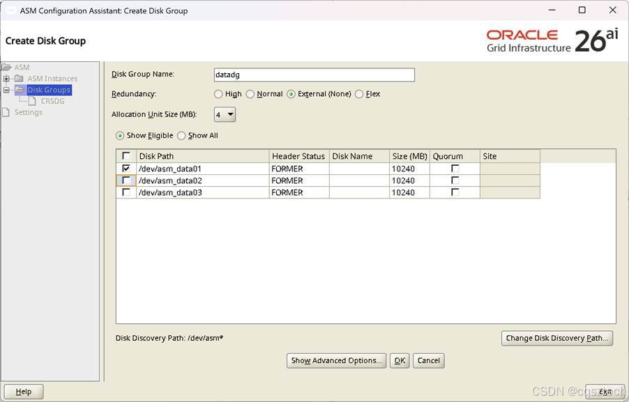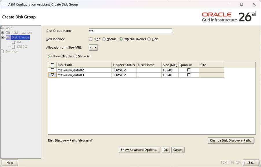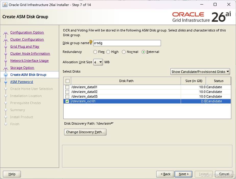 root@rac01 \~\]# yum grouplist \|grep -i install Installed Environment Groups: Minimal Install 3.1.3 安装版本 \[root@rac01 \~\]# cat /etc/oracle-release Oracle Linux Server release 10.1 1. 1. 主机名解析 两个节点/etc/hosts文件添加: |--------------------------------------------------------------------------------------------------------------------------------------------------------------------------------------------------------| | #public ip 192.168.133.101 rac01 192.168.133.102 rac02 #private ip 10.0.0.101 rac01-priv 10.0.0.102 rac02-priv #vip 192.168.133.103 rac01-vip 192.168.133.104 rac02-vip #scanip 192.168.133.105 scanip | 3.3关闭防火墙 Systemctl disable --now firewalld 3.4 关闭SELINUX grubby --update-kernel ALL --args selinux=0 3.5 关闭透明大页 Vim /etc/default/grub ... GRUB_CMDLINE_LINUX=... transparent_hugepage=never ... grub2-mkconfig -o /boot/grub/grub.cfg 3.1.7 创建用户及组 添加用户组: |-------------------------------------------------------------------------------------------------------------------------------------------------------------------------------------------------------------------------------------------------------------| | groupadd -g 54330 oinstall groupadd -g 54331 dba groupadd -g 54332 racoper groupadd -g 54323 asmdba groupadd -g 54324 asmoper groupadd -g 54325 asmadmin groupadd -g 54326 oper groupadd -g 54327 backupdba groupadd -g 54328 dgdba groupadd -g 54329 kmdba | 创建用户: |----------------------------------------------------------------------------------------------------------------------------------------------------| | useradd -u 54322 -g oinstall -G asmoper,asmadmin,asmdba grid useradd -u 54321 -g oinstall -G dba,asmdba,backupdba,dgdba,kmdba,oper,asmadmin oracle | 修改密码: |-----------------------------------------------------------------------| | echo "oracle"\|passwd --stdin oracle echo "grid"\|passwd --stdin grid | 3.6配置用户环境变量 注意节点2 oracle_sid变量需要修改 cat /home/grid/.bash_profile |-----------------------------------------------------------------------------------------------------------------------------------------------------------------------------------------------------------------| | export ORACLE_BASE=/u01/app/grid export ORACLE_HOME=/u01/app/26.1.0/grid export ORACLE_SID=+ASM1 export PATH=$ORACLE_HOME/bin:$PATH export LD_LIBRARY_PATH=$ORACLE_HOME/lib:$ORACLE_HOME/lib32:$LD_LIBRARY_PATH | cat /home/oracle/.bash_profile |-----------------------------------------------------------------------------------------------------------------------------------------------------------------------------------------------------------------------------------| | export ORACLE_BASE=/u01/app/oracle export ORACLE_HOME=$ORACLE_BASE/product/26.1.0/dbhome_1 export ORACLE_SID=orcl1 export PATH=$ORACLE_HOME/bin:$PATH export LD_LIBRARY_PATH=$ORACLE_HOME/lib:$ORACLE_HOME/lib32:$LD_LIBRARY_PATH | 3.7 创建相关目录 创建目录: |------------------------------------------------------------------------------------------------------------------------------------------------------------------------------------------------------| | mkdir -p /u01/app/26.1.0/grid mkdir -p /u01/app/grid mkdir -p /u01/app/oracle/product/26.1.0/dbhome_1 chown -R grid:oinstall /u01/app chown -R oracle:oinstall /u01/app/oracle chmod -R 775 /u01/app | 3.8 设置用户limit Cat /etc/security/limits.conf |---------------------------------------------------------------------------------------------------------------------------------------------------------------------------------------------------------------------------------------------------------------------------------------------------------------------------------------------------------------------------------------------| | oracle soft nproc 655350 oracle hard nproc 655350 oracle soft nofile 655360 oracle hard nofile 655360 grid soft nproc 655350 grid hard nproc 655350 grid soft nofile 655360 grid hard nofile 655360 oracle soft stack 102400 oracle hard stack 327680 grid soft stack 102400 grid hard stack 327680 oracle soft memlock -1 oracle hard memlock -1 grid soft memlock -1 grid hard memlock -1 | 3.9 修改内核参数 在9及以上版本,/etc/sysctl.conf下配置内核参数仍然可以永久生效,但按照推荐修改/etc/sysctl.d/99-oracle.conf文件 执行sysctl -p命令使参数生效 这里可以不设置,26AI,可以帮我们自动修复。Automatic Self Correction 1. 存储设置 1. 创建共享磁盘 在虚拟机软件的安装目录下,有个vmware-vdiskmanager.exe文件 比如:C:\\Program Files (x86)\\VMware\\VMware Workstation 1. 1. 1. 创建集群盘 用于验证,使用外部冗余只创建一个盘即可,大小2g vmware-vdiskmanager.exe -c -s 2048Mb -a lsilogic -t 2 "E:\\vm\\26ai\\sharedisk\\ocr_vote.vmdk" 说明: -c 选项为创建, -s 指定大小, -t 2 为预分配 1. 1. 1. 创建数据盘 创建3个10g大小的盘,两个用于数据,一个用于fra,26ai,不再需要GIMR 磁盘 vmware-vdiskmanager.exe -c -s 10240Mb -a lsilogic -t 2 "E:\\vm\\26ai\\sharedisk\\data01.vmdk" vmware-vdiskmanager.exe -c -s 10240Mb -a lsilogic -t 2 "E:\\vm\\26ai\\sharedisk\\data02.vmdk" 最后结果  1. 1. 添加到虚拟机 4.2.1 在虚拟机中添加硬盘,总线设成scsi1:0  4.2.2修改虚拟机配置文件 分别打开两台虚拟机目录中的vmx文件,在最后一行添加: disk.EnableUUID = "TRUE" disk.locking = "FALSE" scsi1.sharedBus = "virtual" scsi1.shared = "TRUE" diskLib.dataCacheMaxSize = "0" diskLib.dataCacheMaxReadAheadSize = "0" diskLib.DataCacheMinReadAheadSize = "0" diskLib.dataCachePageSize = "4096" diskLib.maxUnsyncedWrites = "0" 1. 1. 产生设备 使用udev方式 cat /etc/udev/rules.d/99-oracle-asmdevices.rules KERNEL=="sd\*", ENV{DEVTYPE}=="disk", SUBSYSTEM=="block", PROGRAM=="/usr/lib/udev/scsi_id -g -u -d $devnode", RESULT=="36000c298c023134185171eee842e13be", RUN+="/bin/sh -c 'mknod /dev/asm_ocr01 b $major $minor; chown grid: