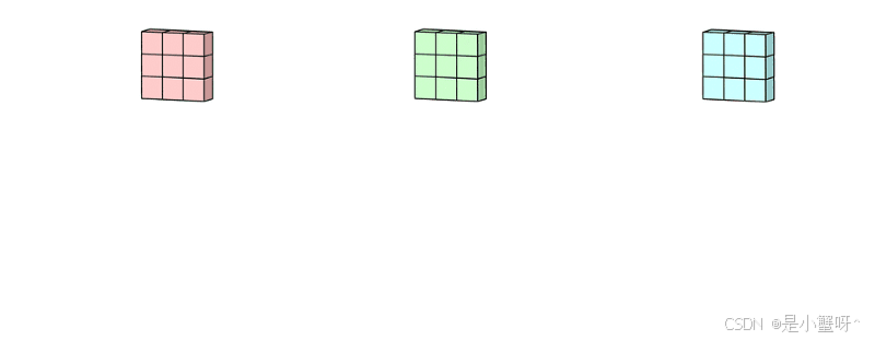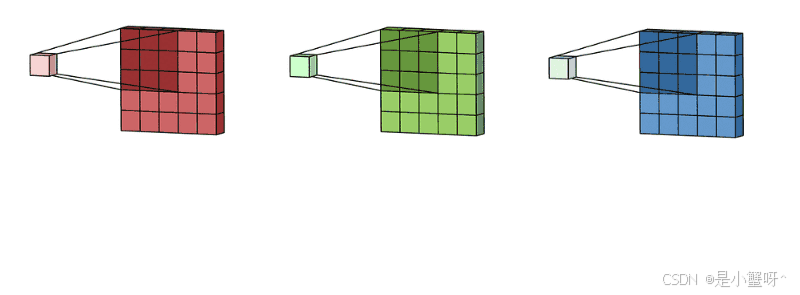 拥有多个通道的卷积,例如处理彩色图像时,分别对R, G, B这3个层处理的3通道卷积,如下图: