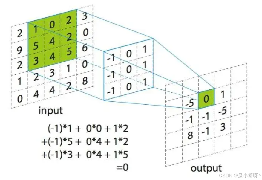 卷积核在输入图像上扫描,将卷积核与输入图像中对应位置的数值逐个相乘,最后汇总求和,就得到该位置的卷积结果。不断移动卷积核,就可算出各个位置的卷积结果。如下图: