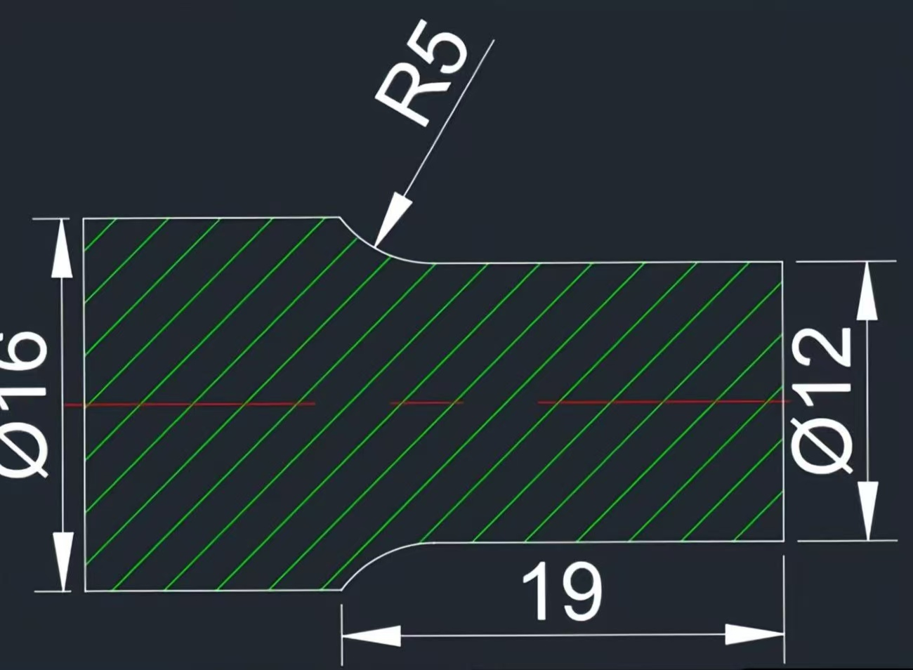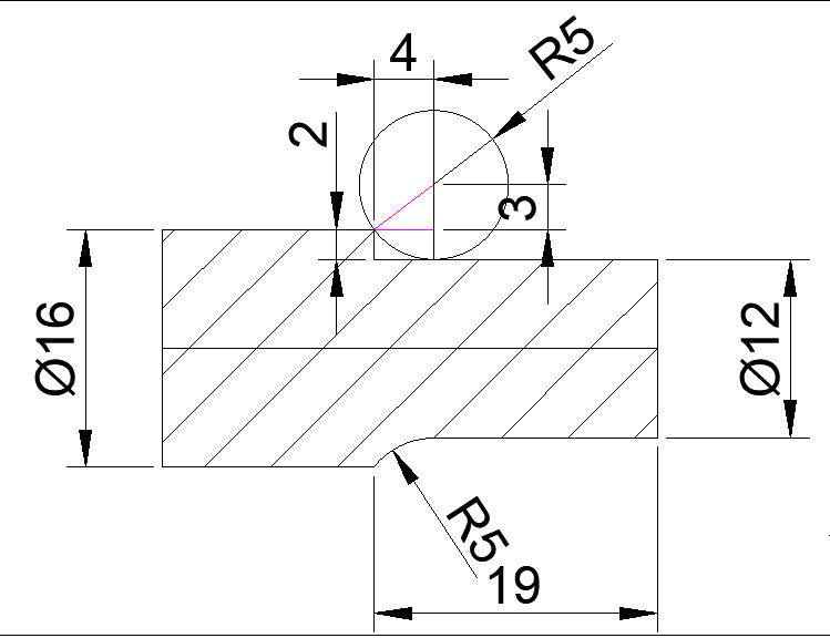 直径12mm宽度19mm的台阶处标注了一个R5的圆角,这个圆角要如何绘制出来?如果要自动绘制图形时,这个圆弧又该如何绘制出来呢?大家有没有想到?下面来看看有哪些方法解决这个问题: