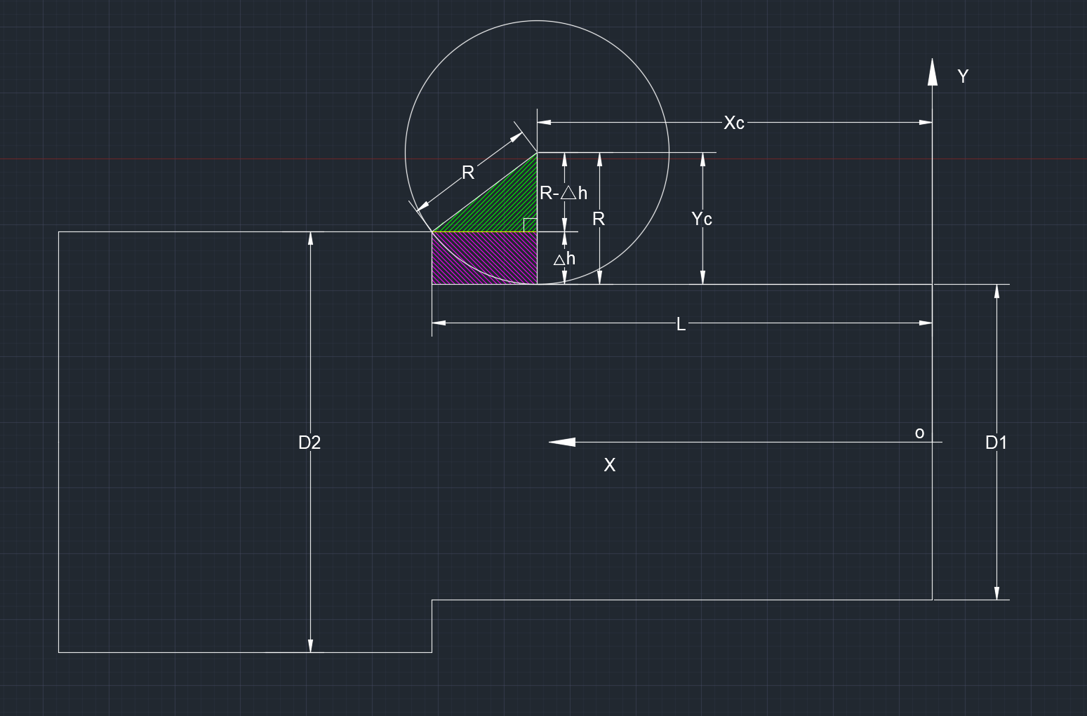 可以看到:首先建立坐标系,△h=(D2-D1)/2,要求的圆角半径为R,刚才那个三角形的一条直角边为(R-△h),另外一条直角边用勾股定理a²+b²=c²计算就可以了。这样的话,圆心的坐标也就清楚了: