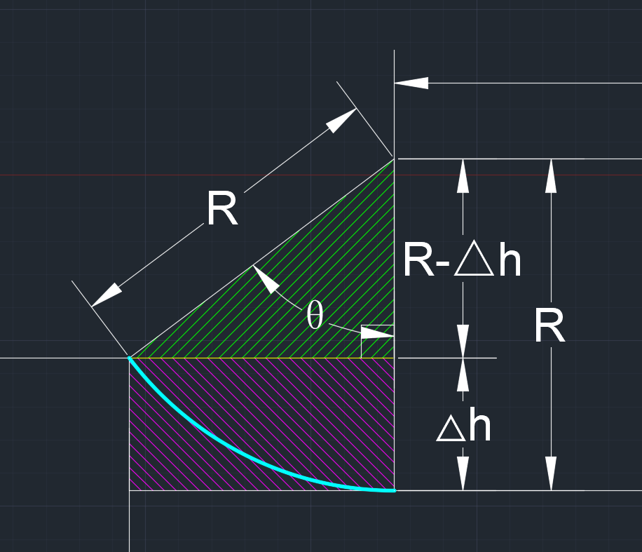 可以看上面这个图,圆弧对应的圆心角θ就是直角三角形的一个锐角,这个角度计算也没什么难度,一个反余弦函数搞定,有了数学模型就可以编程实现自动绘图。