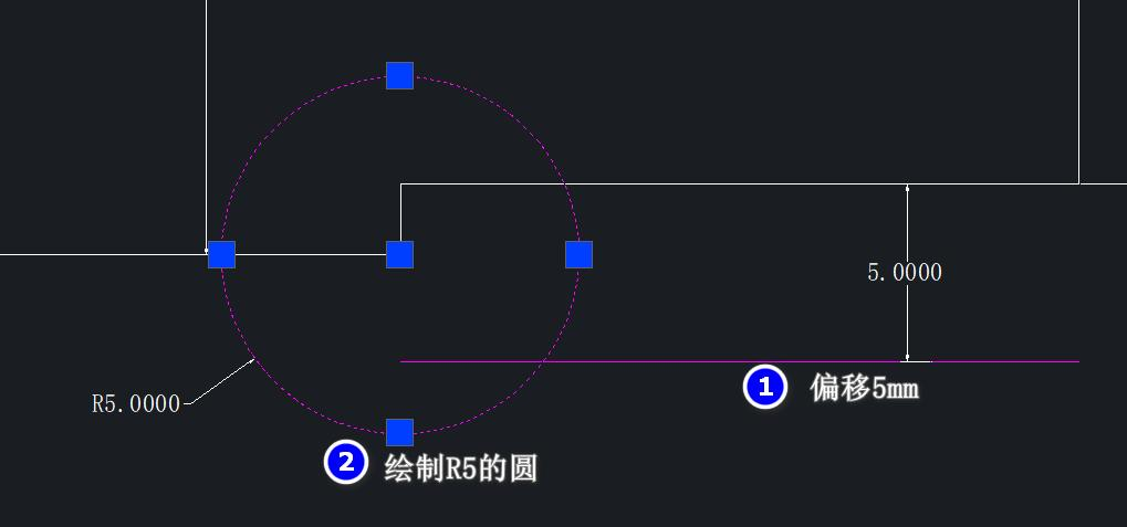 直径12的一条边偏移5mm,也就是倒圆角的半径值,然后以尖点为圆心绘制一个圆。这样偏移的直线和圆会产生一个焦点。