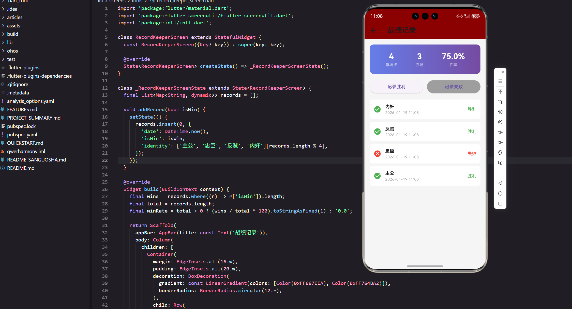 这里我们使用 StatefulWidget 来管理战绩记录的状态变化。引入了 intl 包用于日期格式化,这是处理时间显示的标准做法。flutter_screenutil 确保在不同设备上的适配效果。