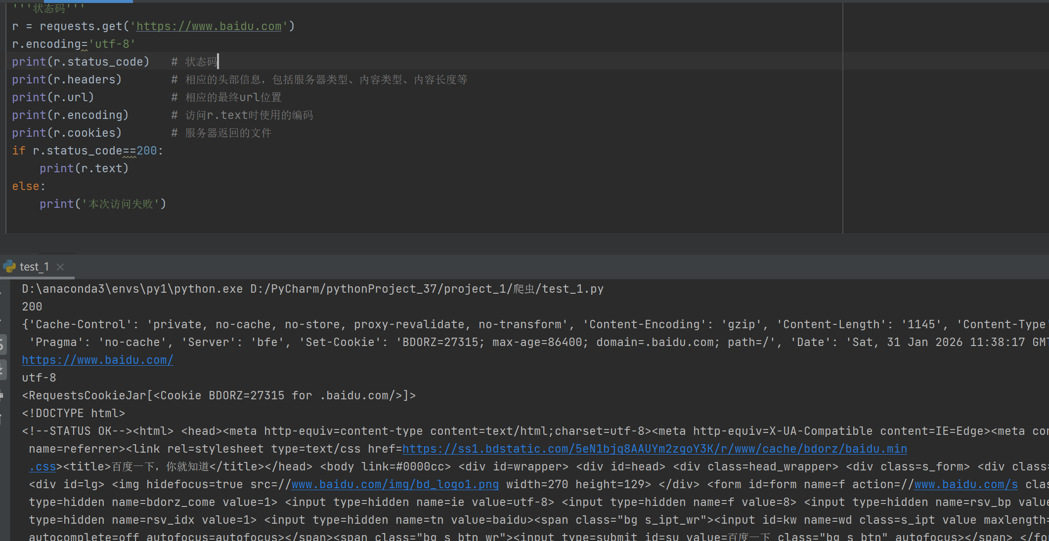 HTTP 状态码(如 200 成功,404 未找到) | print(response.status_code) → 200 |