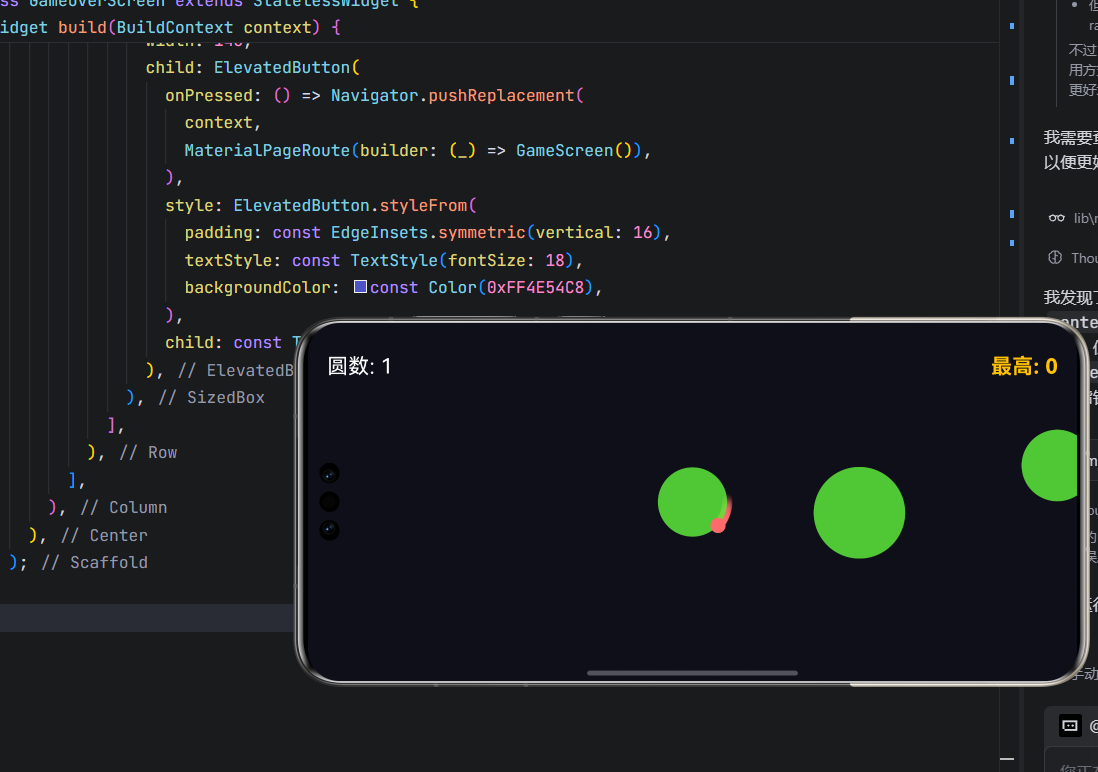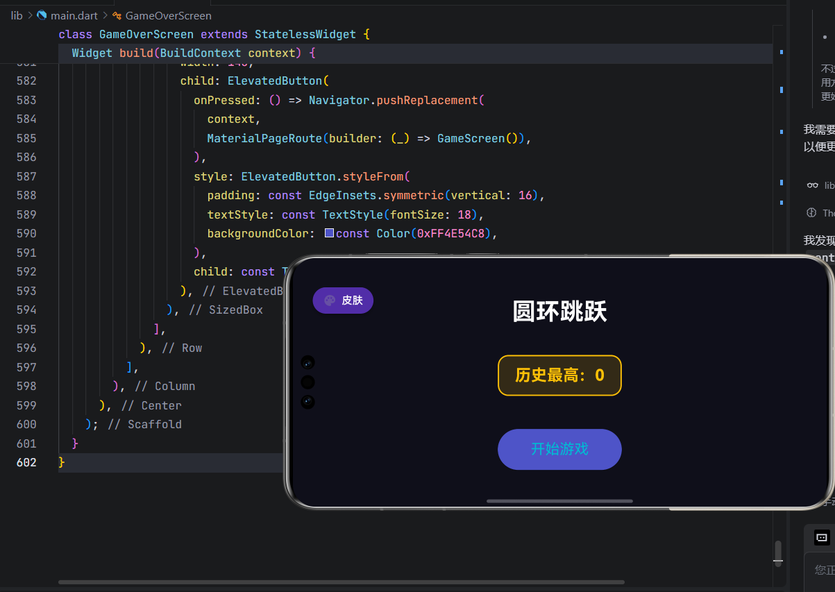 在前三篇中,我们逐步构建了游戏的物理引擎、自定义绘制系统和相机跟随机制。但一个真正"可发布"的游戏,还需要完整的用户流程 :主菜单、历史最高分、游戏结束页、数据持久化等。本篇将整合所有模块,打造一个功能完整、视觉流畅、数据持久的小游戏------《圆环跳跃》。