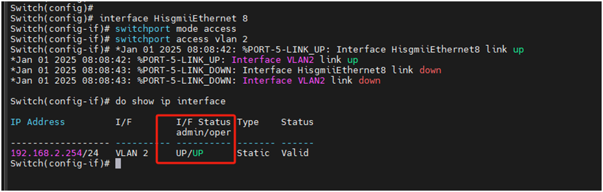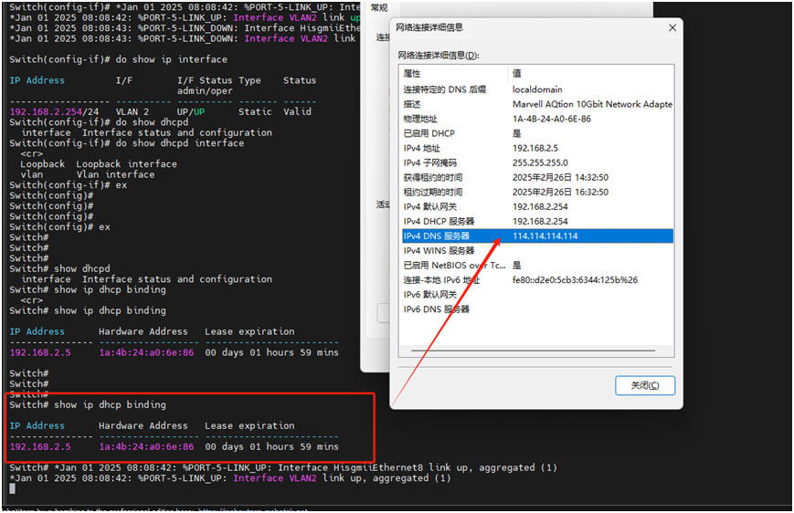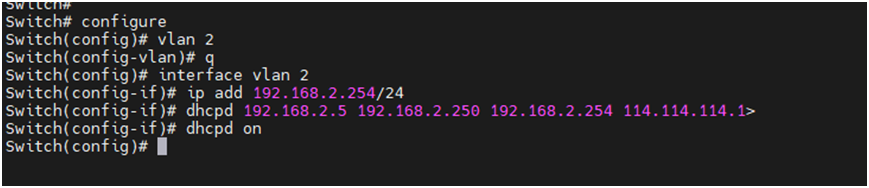 Switch(config-if)# dhcpd 192.168.2.5 192.168.2.250 192.168.2.254 114.114.114.114