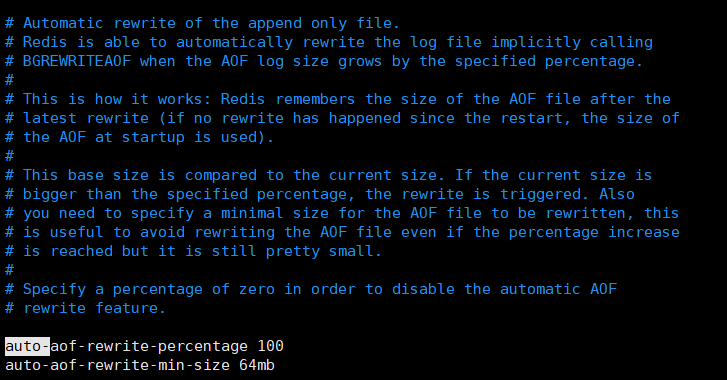 重写机制可以分为两种,一种是自动触发,根据auto-aof-rewrite-min-size和auto-aof-rewrite-percentage两个配置项进行触发,auto-aof-rewrite-min-size表示触发重写时AOF的最小文件大小,默认为64MB,auto-aof-rewrite-percentage表示当前AOF占用空间大小相比于上次重写时增加的比例。另外一种是手动触发,使用bgrewriteaof进行重写。