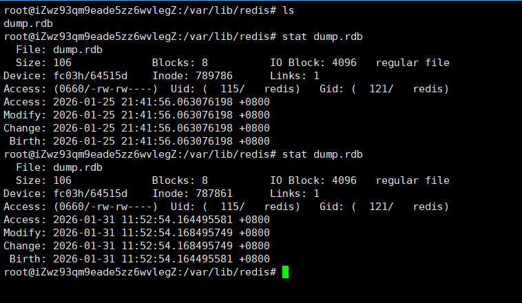 如果我们想要观察到这个过程,可以在执行bgsave前后观察文件的inode: