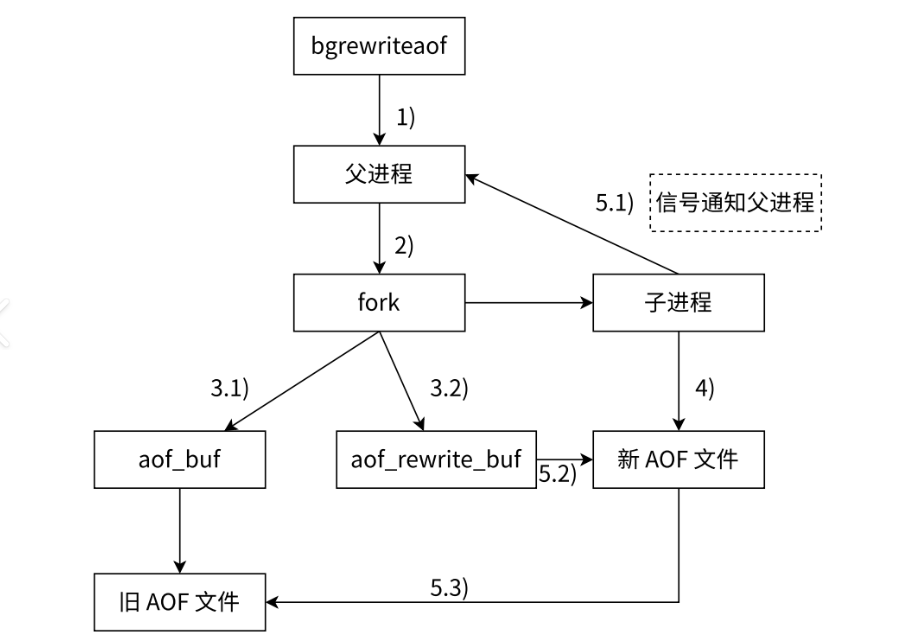 AOF重写也是需要创建子进程的,父进程继续去接收请求,子进程负责将内存中的数据读取出来,以AOF文件的格式将数据写入一个新的AOF文件中,父进程也会继续将新的操作记录到旧的AOF文件中,当子进程将AOF文件创建完成以后,会通过信号通知父进程。但是在fork的时候,子进程只会继承fork那一瞬间的数据,在后续子进程处理AOF文件的时候,父进程内存中的数据修改是不会影响子进程的,此时,父进程准备了一个aof_rewrite_buf缓冲区,用于接收fork之后改变的数据,当父进程接收到子进程的通知信号以后,就会将aof_rewrite_buf缓冲区里的数据记录到新的AOF文件里。当前正在执行aof重写的时候,执行bgrewriteaof会直接返回,如果当前正在执行rdb文件的生成的时候执行bgrewriteaof,aof重写操作会等待rdb文件生成完成,再执行aof重写。