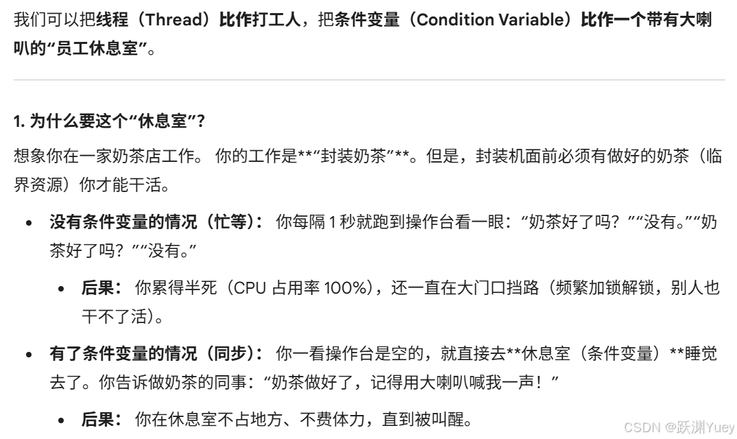 没有条件变量之前,一个线程可能会多次申请锁访问临界资源但是并没有对临界资源做什么事情,因为临界资源没有就绪,然后释放锁,这样会造成效率降低;有了条件变量之后,这个线程访问一次临界资源发现临界资源不满足自己的需求,进而直接到等待队列中等待临界资源就绪,当临界资源就绪的时候,条件变量就会唤醒这个挂起的线程。