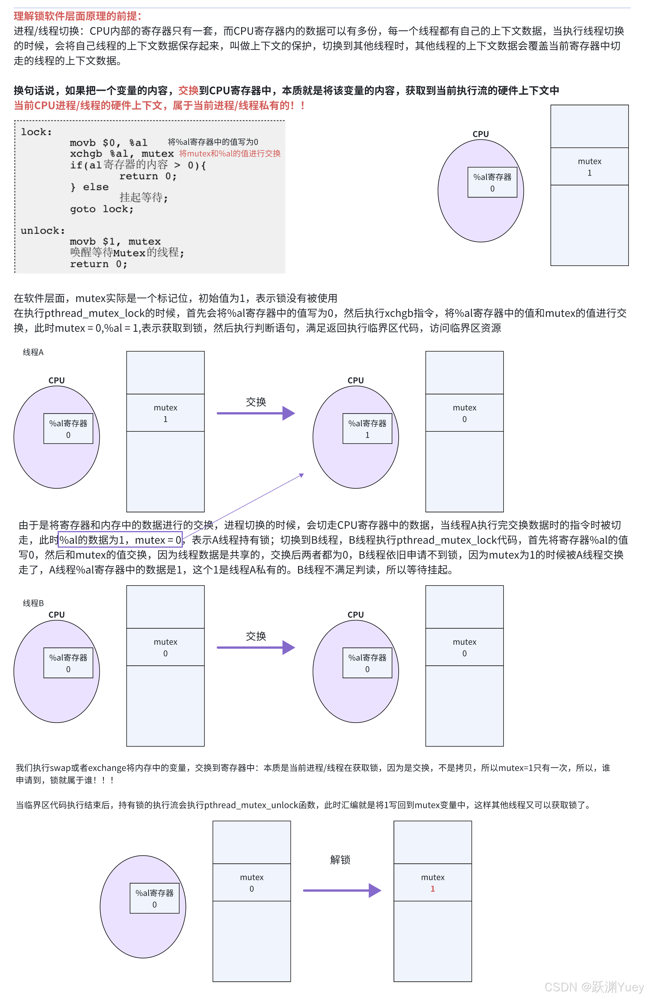 为了实现互斥锁操作,大多数体系结构都提供了swap或exchange指令,该指令的作用是把寄存器和内存单元的数据相交换,由于只有一条指令,保证了原子性,即使是多处理器平台,访问内存的总线周期也有先后,一个处理器上的交换指令执行时另一个处理器的交换指令只能等待总线周期。