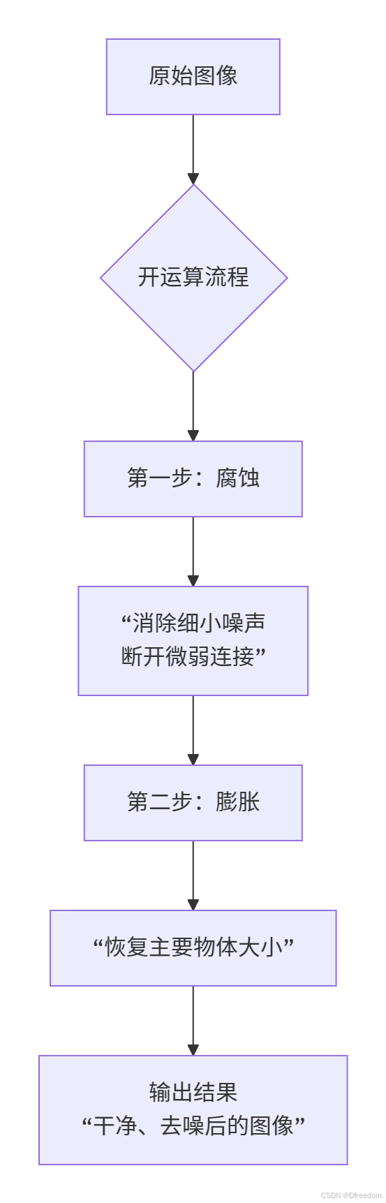 开运算的数学定义是:开运算(A, B) = 膨胀( 腐蚀(A, B) , B),其中 A 是原始图像,B 是结构元素。