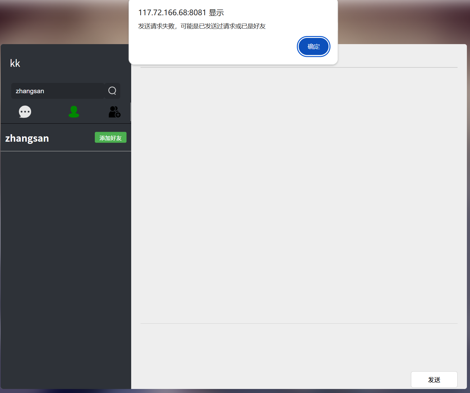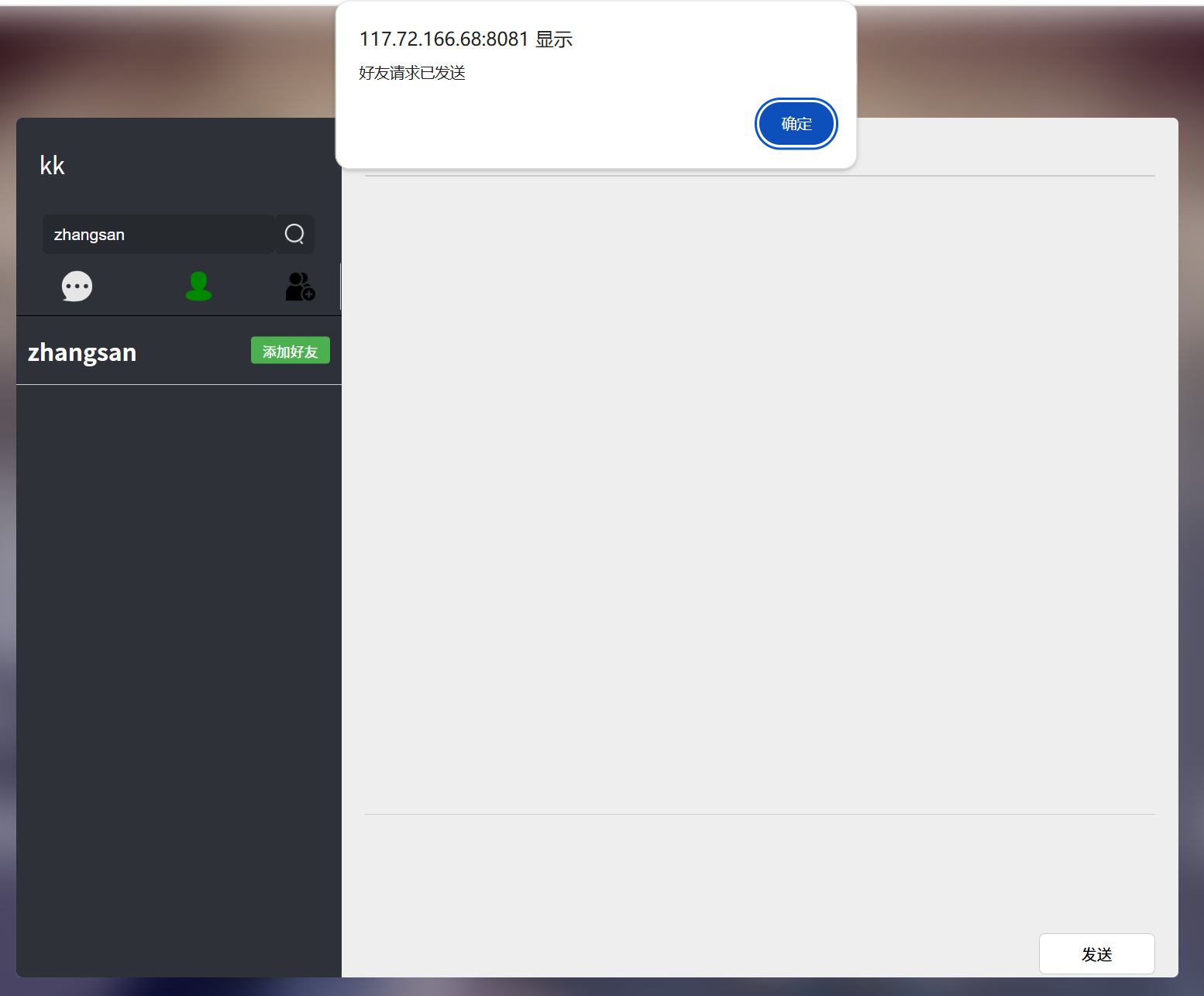 ④点击添加好友按钮,并点击发送验证信息弹窗的确认按钮