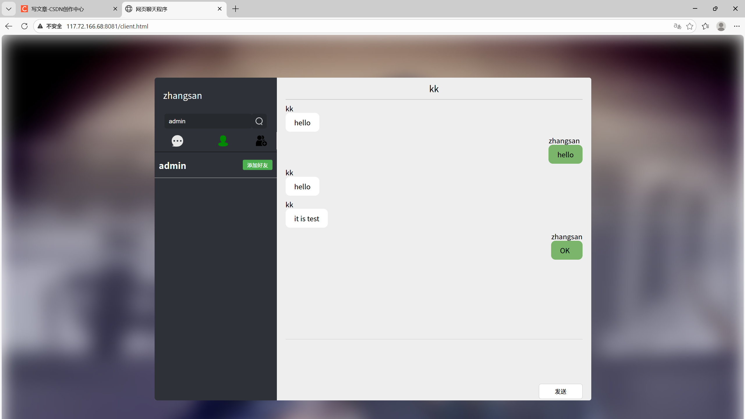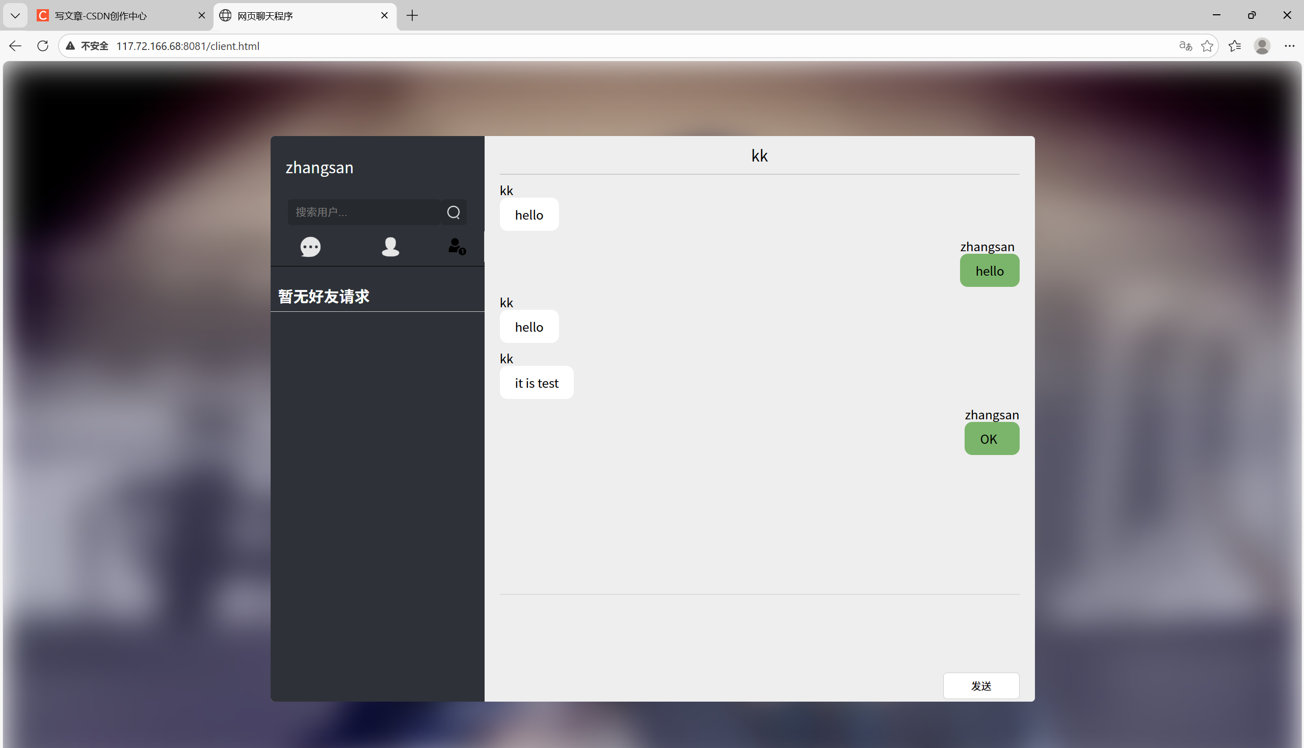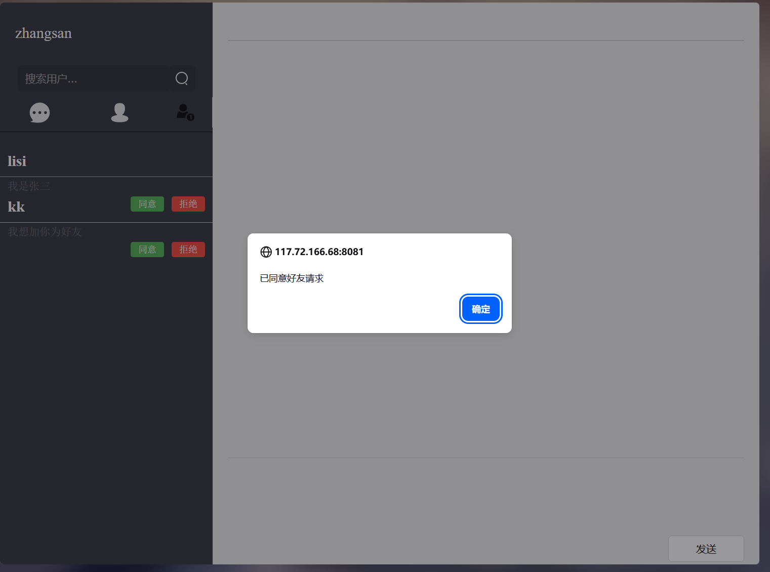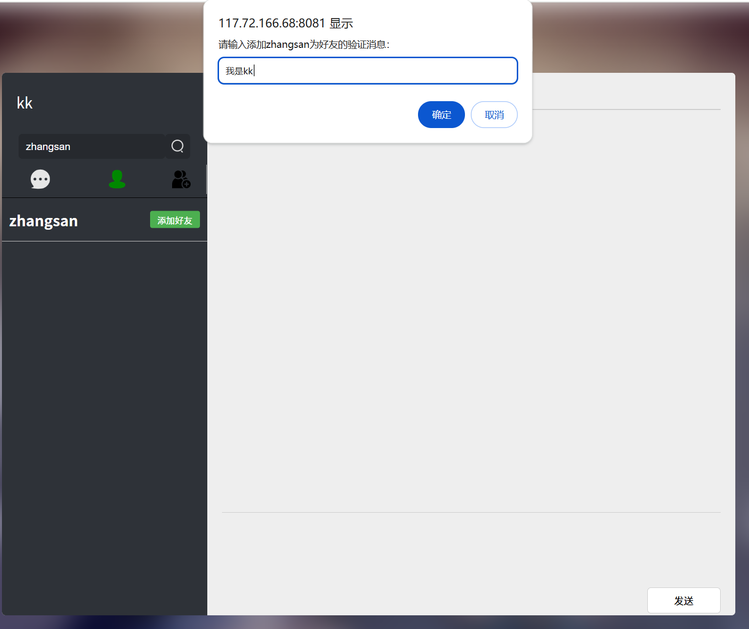 ②点击添加好友按钮,并在发送验证消息弹窗中输入验证信息