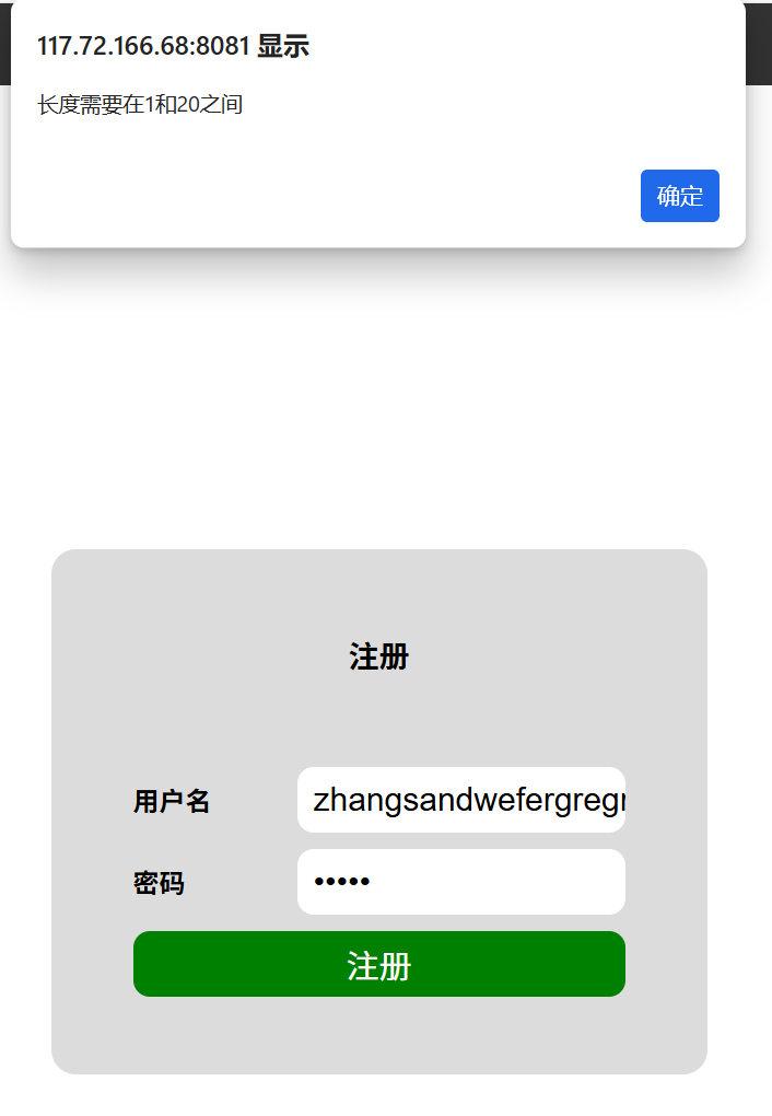 ⑤输入长度大于20的用户名,长度不小于5的密码