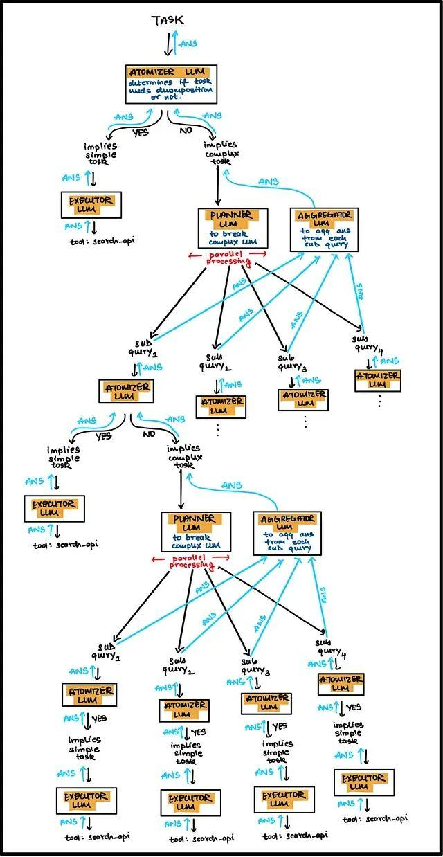 Sentient Labs基于递归思想,设计出了ROMA(Recursive Open Meta Agent)架构,这是一种全新的递归式搜索Agent架构,专门用于处理层次化的复杂问题。ROMA的核心思想是:把复杂问题递归地分解成子问题,每个子问题独立处理,处理完成后将结果向上回溯,整合成为父问题的答案,最终形成整个复杂问题的完整答案。与传统的并行拆分不同,ROMA的子问题之间可以存在依赖关系,某个子问题的答案可能是另一个子问题的输入,这种设计更符合复杂研究任务的实际结构。